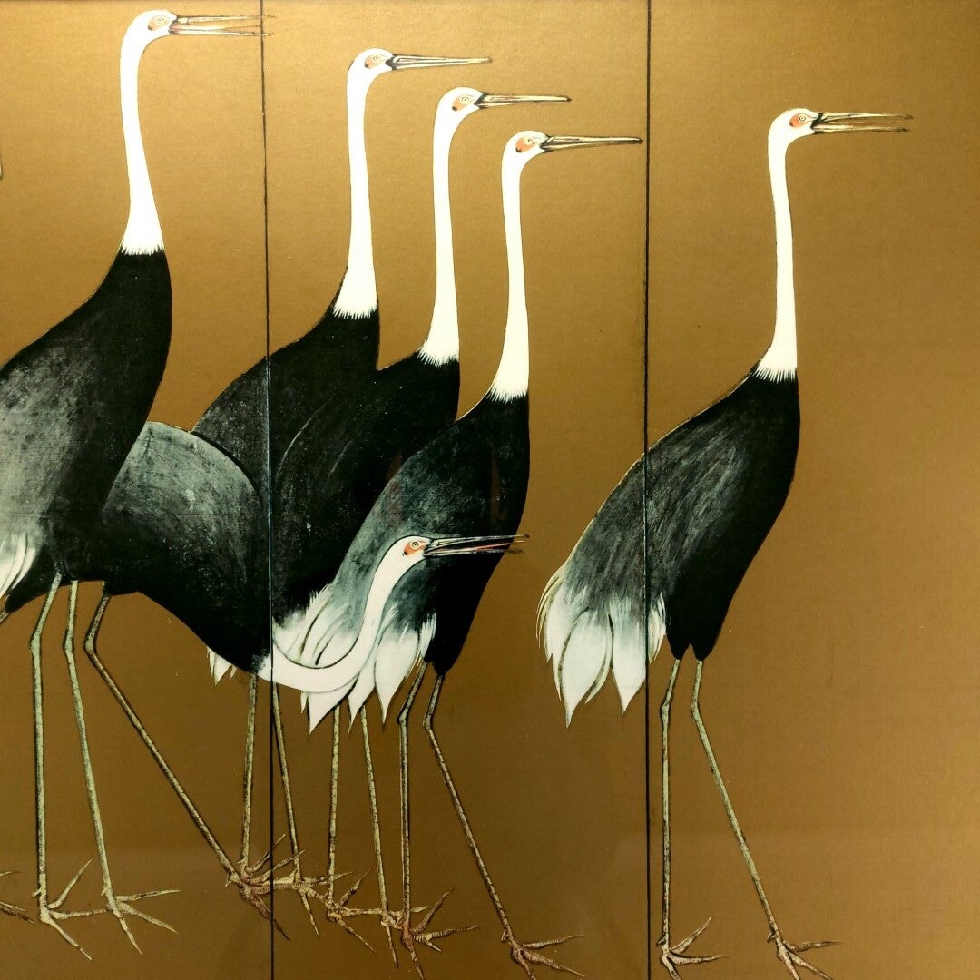 Mooie grote replica print van het schilderij 'Cranes' door Ogata Korin (1658-1716). De Japanse kunstschilder Ogata Korin was een belangrijke vertegenwoordiger van de Rinpa school tijdens de Edo periode. Hij is vooral bekend voor zijn schilderijen op schermen, lakwerk en textieldesigns. Het originele werk 'Cranes' valt te bewonderen in de Freer Gallery of Art van het Smithsonian Institution in Washington D.C.. Deze print is zeer degelijk ingelijst in een zwaar metalen zwart kader met vergulde gemarmerde binnenrand, en in excellente staat.