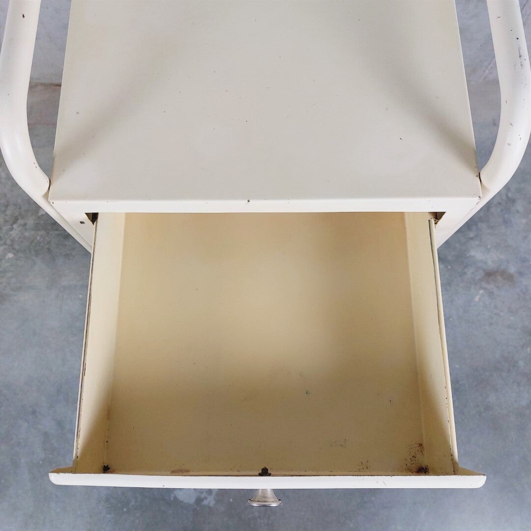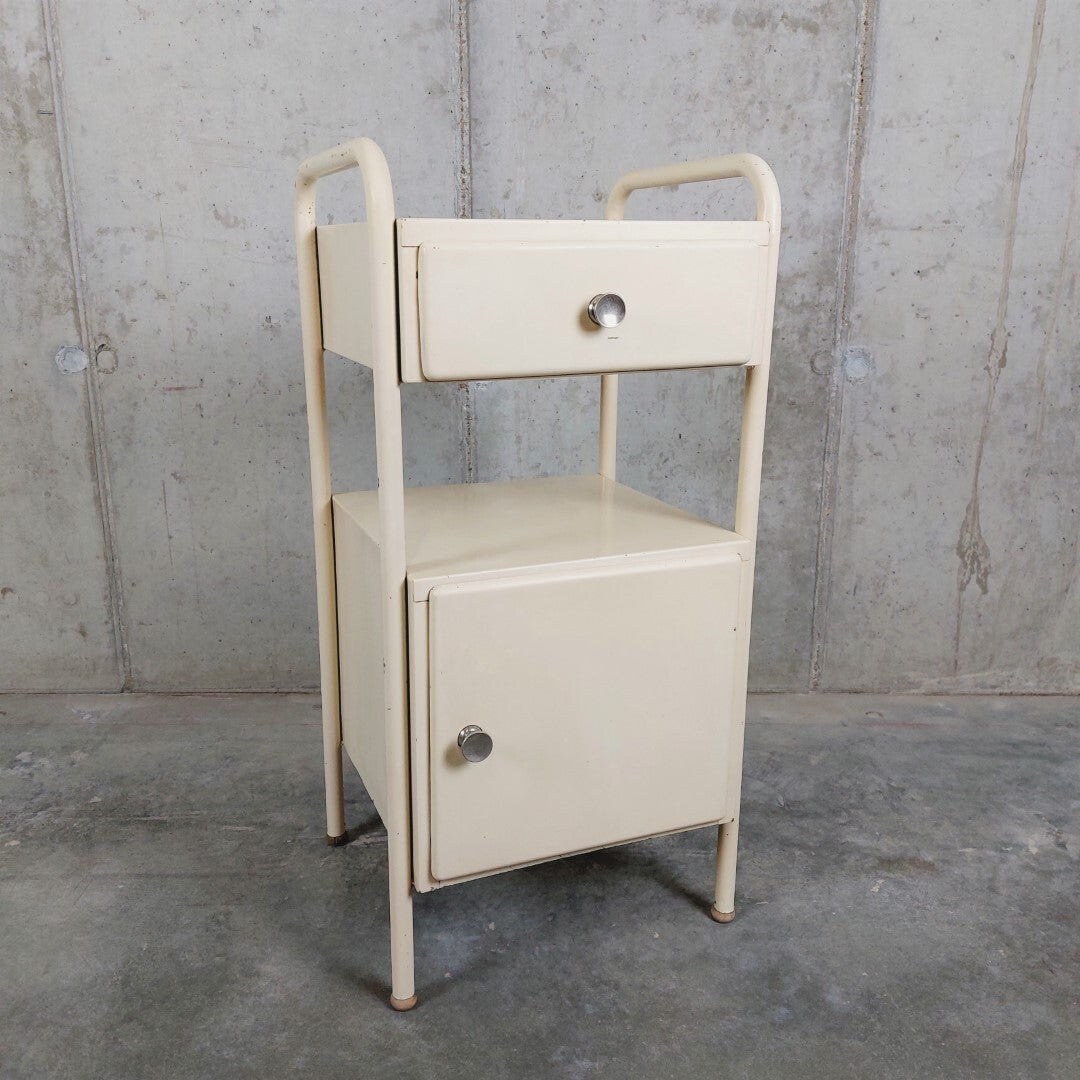 Metalen ziekenhuis (nacht)kastje uit het midden van de 20e eeuw, met lade en opbergvak. Z'n industriële karakter wordt nog versterkt door ouderdomssporen die voor een geleefd uiterlijk zorgen. Het kastje is in goede staat en werd ontworpen door meubelfabrikant Mertens uit Mortsel.