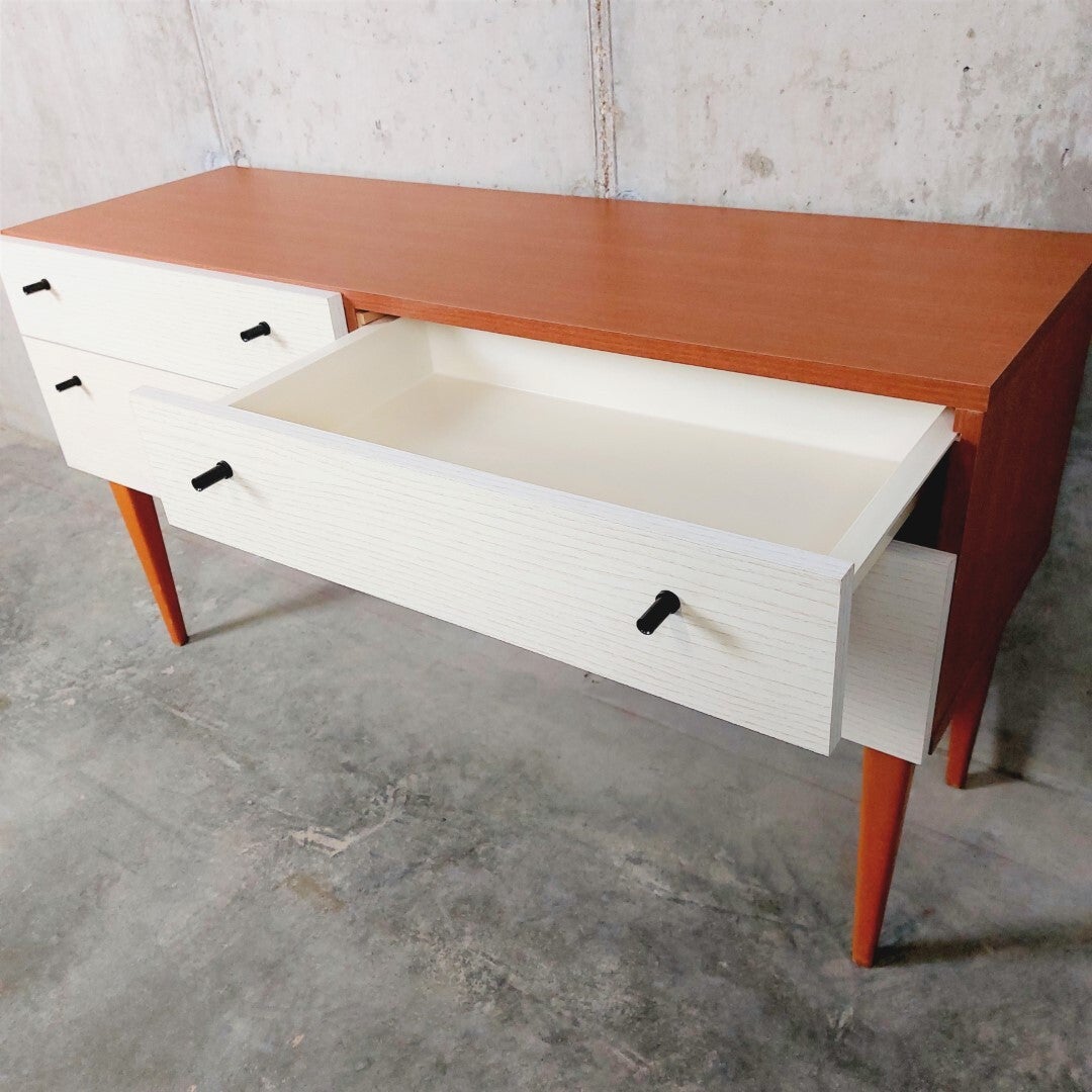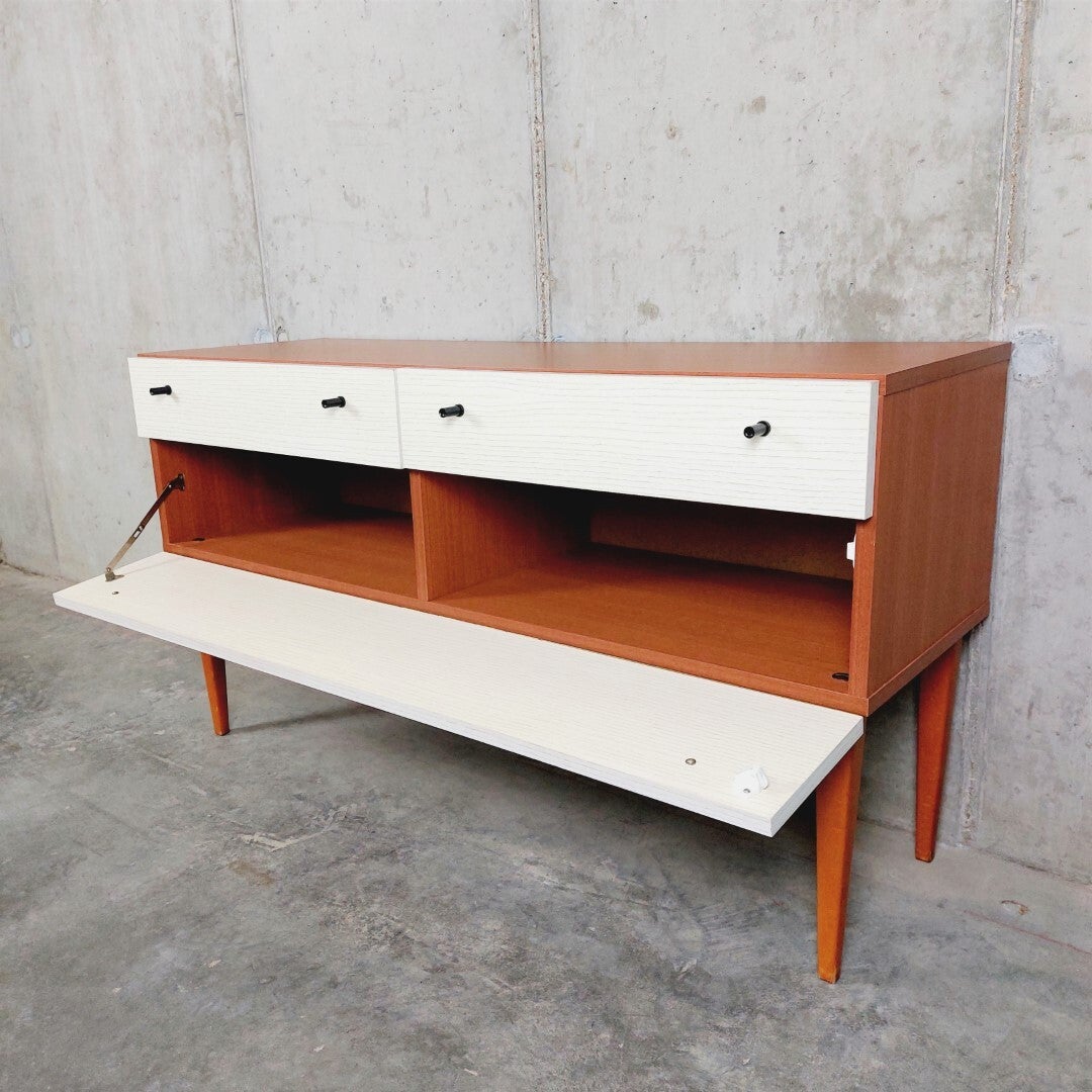 Vintage lowboard kast in Scandinavische stijl uit de jaren '60. De kast heeft een openklappende deur onderaan en 2 lades in kunststof bovenaan, en is afgewerkt met fineer in een leuke kleurencombinatie. In heel goede vintage staat, afgezien van enkele kleine chipjes aan het fineer achteraan het bovenblad zijn er amper ouderdomssporen.
