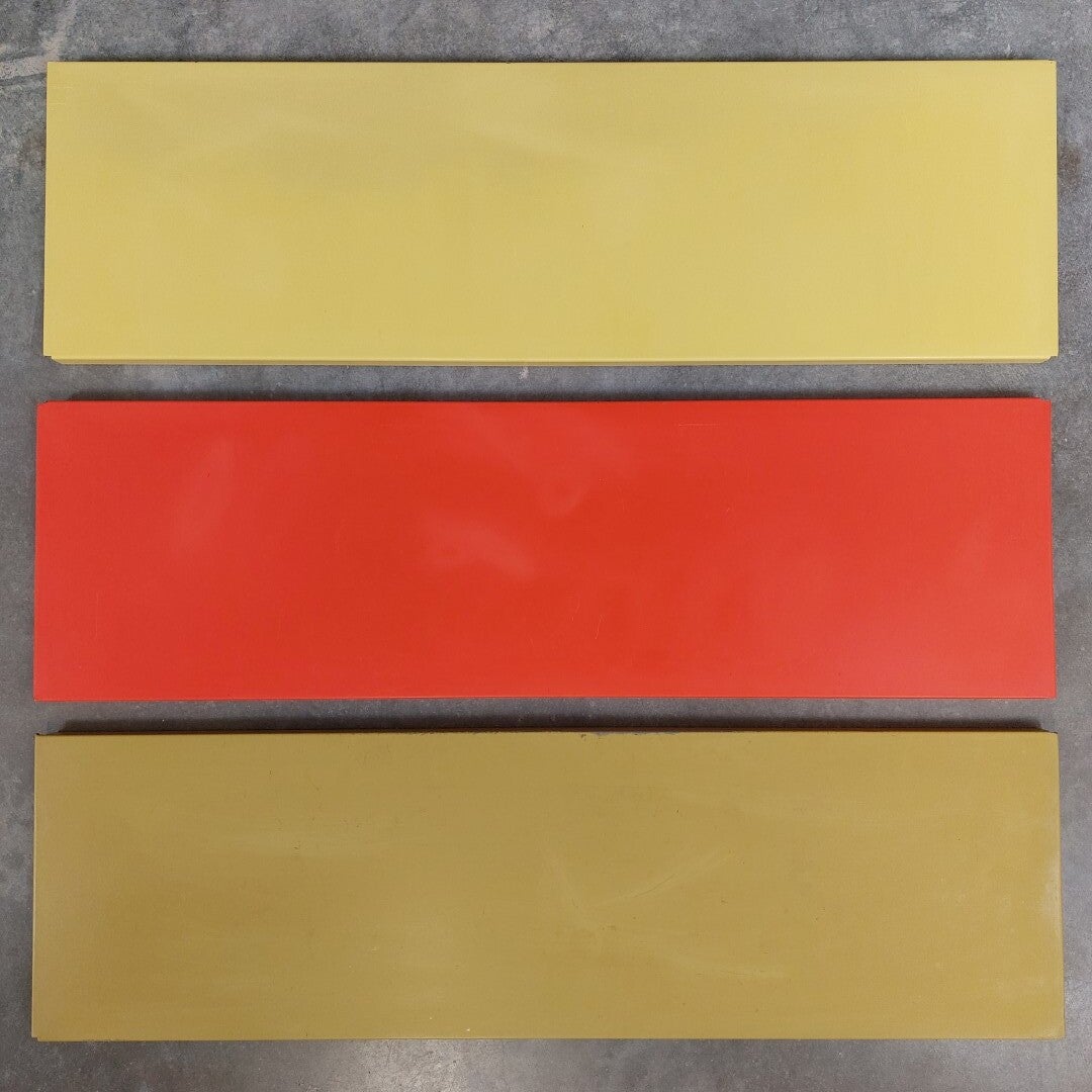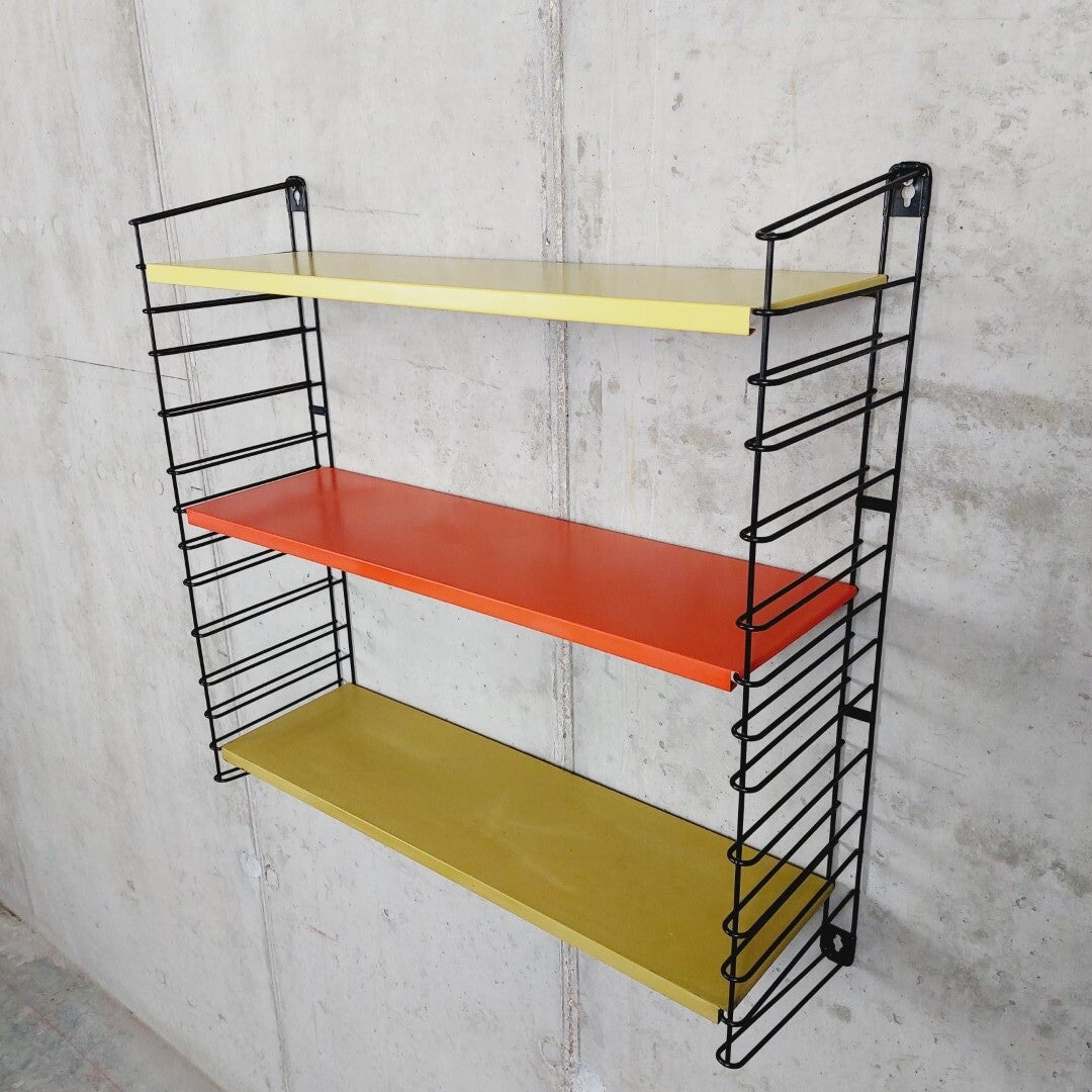 Het blijven leuke en kleurrijke klassiekers, deze wand- of boekenrekjes van het Nederlandse Tomado. Ze werden ontworpen door Adriaan Dekker in 1958, en zijn een voorbeeld van tijdloos design, functionaliteit en fun door de kleurencombinaties. Dit is een origineel exemplaar uit de jaren '60 met als kleuren geel, rood en oker. De legplanken en beugels zijn allen gemerkt met het Tomado logo en bevinden zich in goede vintage staat met gebruikssporen conform de leeftijd.