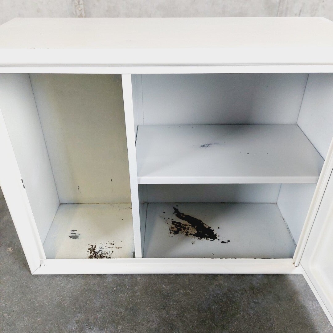 Vintage hangkastje uit de jaren '50 in wit geverfd metaal. Het kastje is in goede vintage staat, met ouderdomssporen.