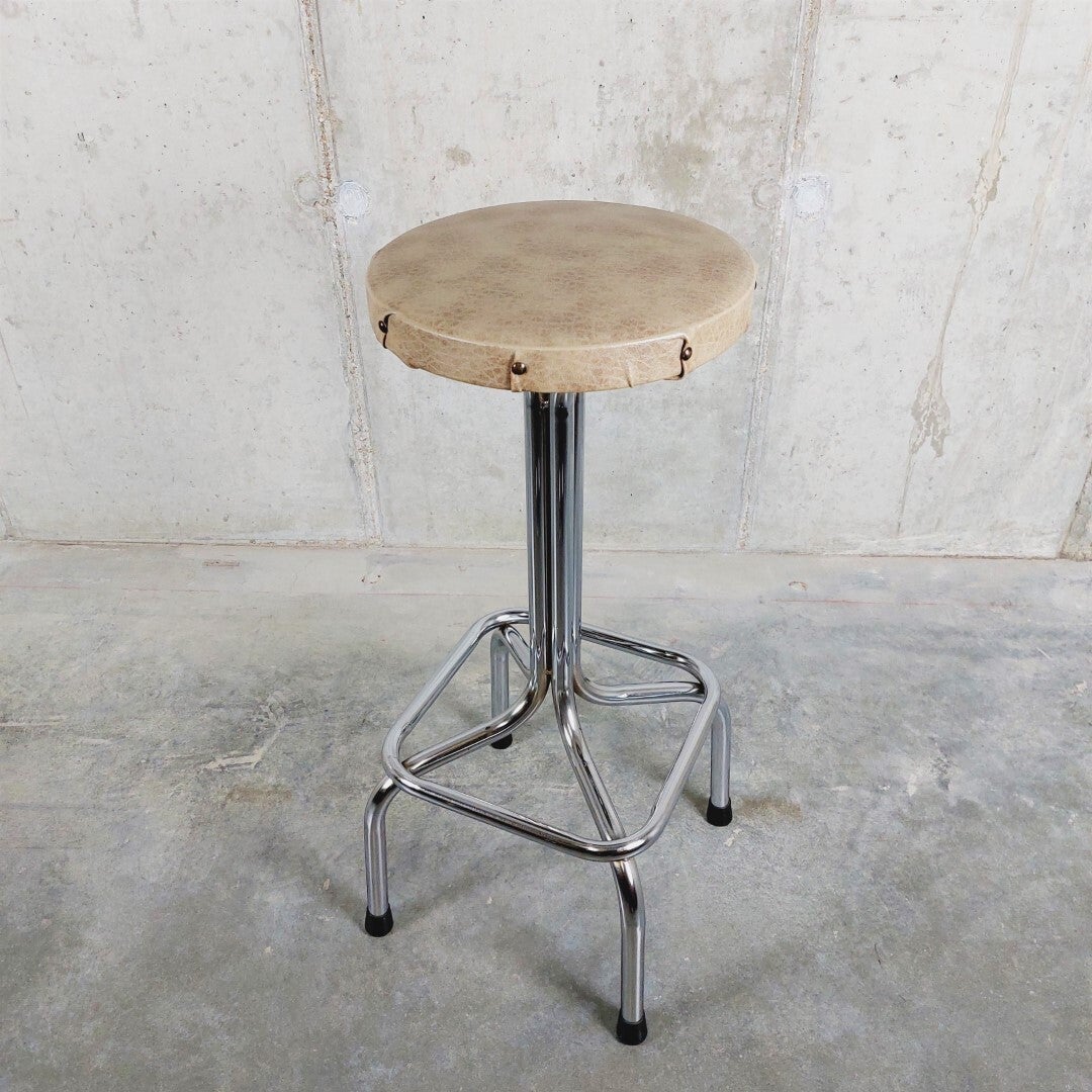 Hoge vintage kruk uit de jaren '60 met voetsteun. Het onderstel is in chroom en de zitting is afgewerkt met grijs-bruine vinyl en siernagels. In goede vintage staat met lichte ouderdomssporen.