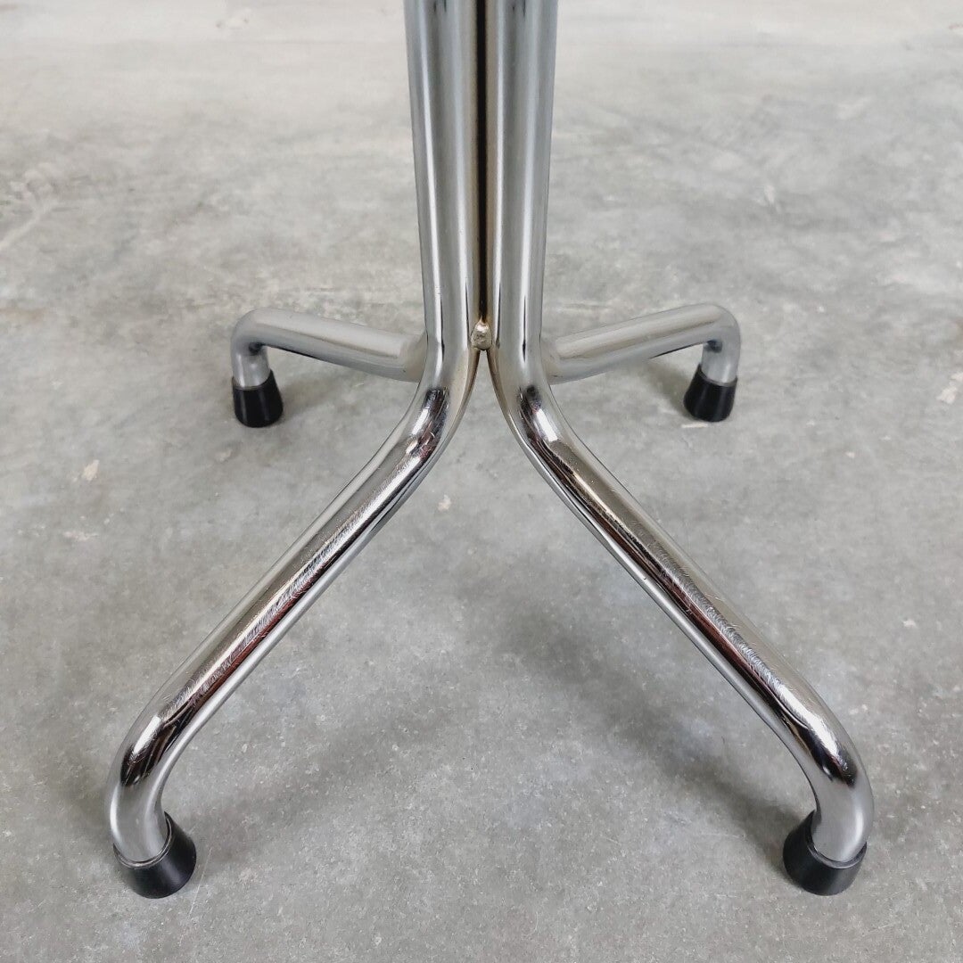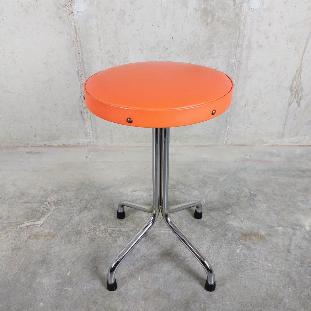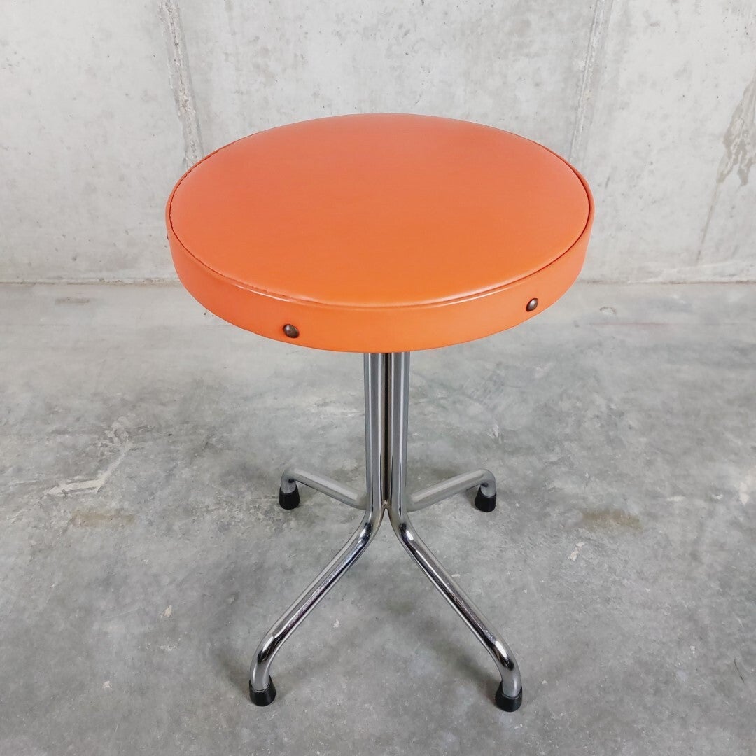 Funky vintage krukje uit de jaren '60, met onderstel in chroom en zitting afgewerkt met oranje skai en siernagels. In heel goede vintage staat.
