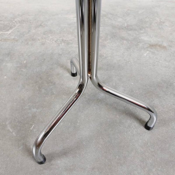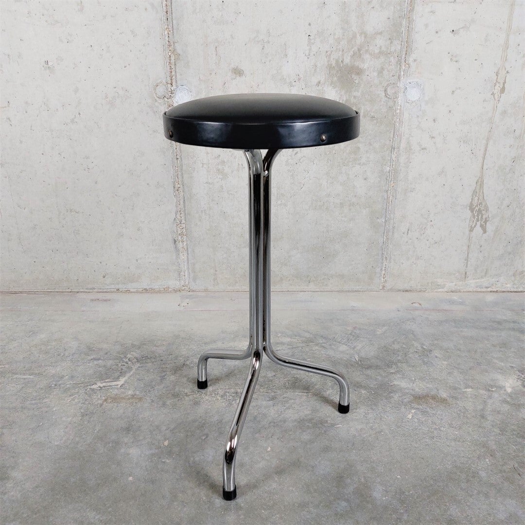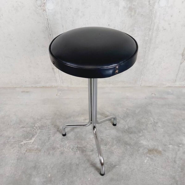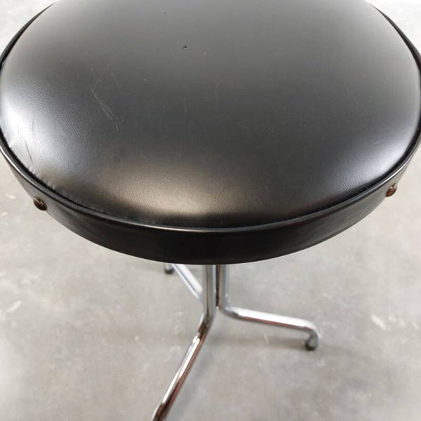 Knap vintage krukje uit de jaren '60 met een tripod voet. Het onderstel is in chroom en de zitting is afgewerkt met zwarte skai en siernagels. In goede vintage staat met lichte ouderdomssporen.