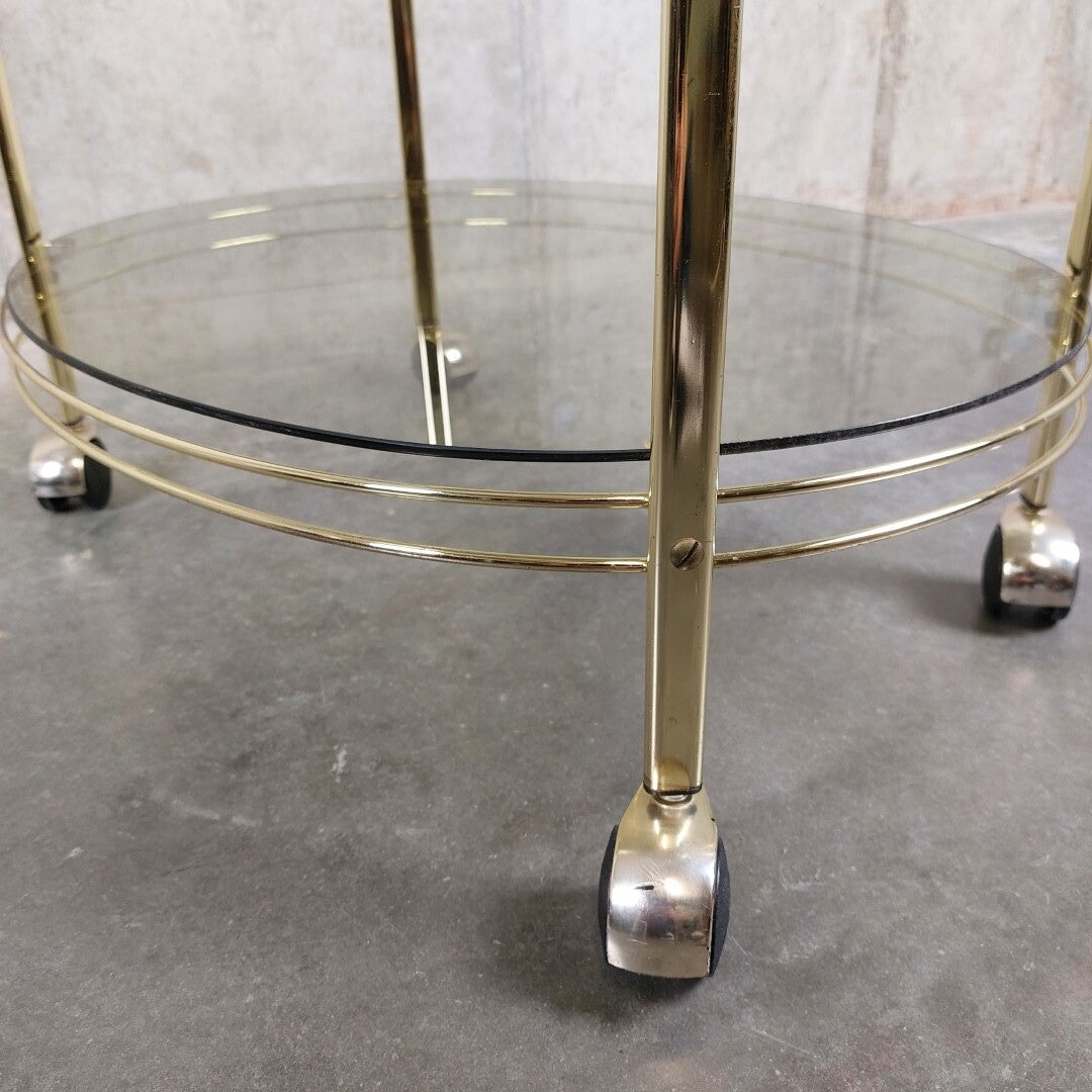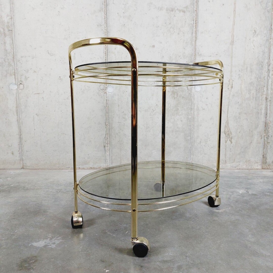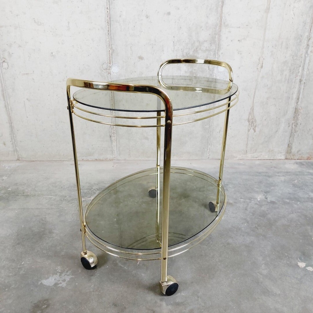 Mooie ovale trolley / serveerwagen uit de jaren '70 - '80 in Hollywood Regency stijl. De licht gefumeerde glazen bladen en vergulde afwerking geven deze barwagen z'n chique uitstraling. Een stijlvolle blikvanger die ook als bijzetmeubel gebruikt kan worden. De trolley is in goede vintage staat met lichte gebruikssporen.
