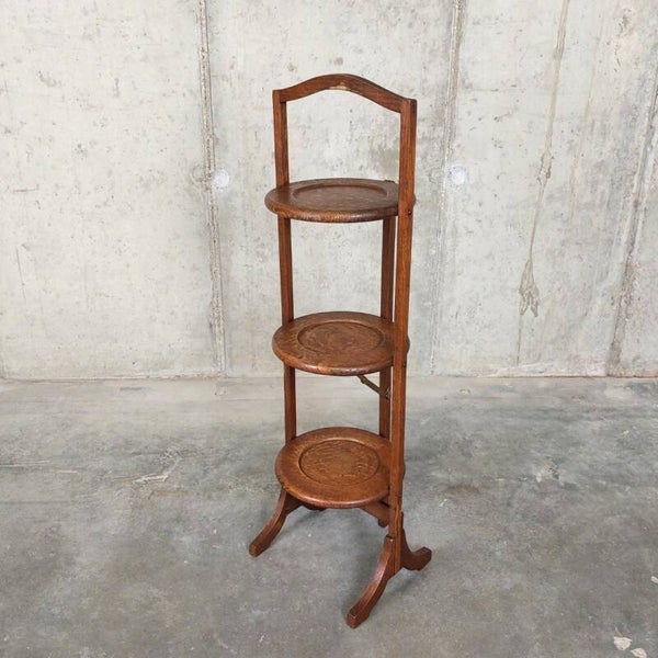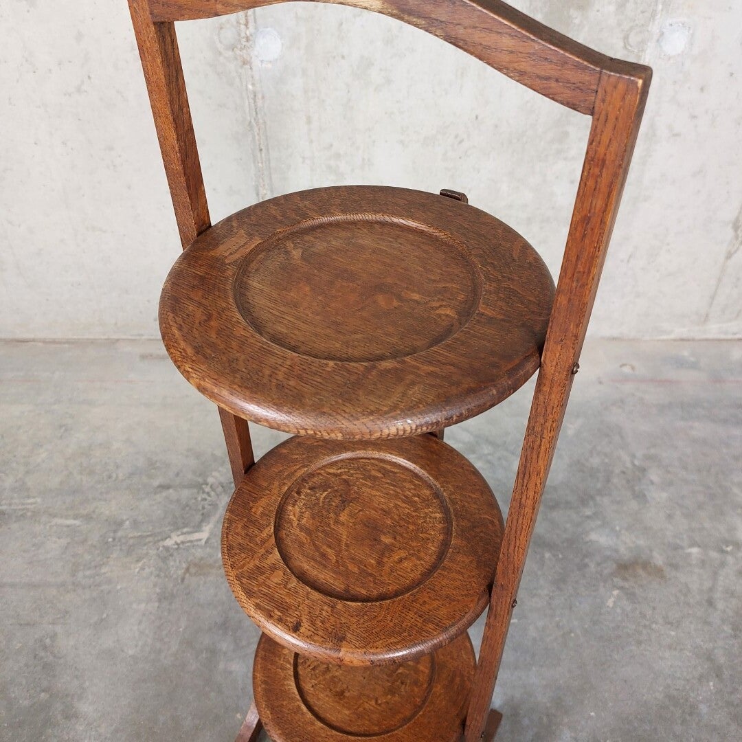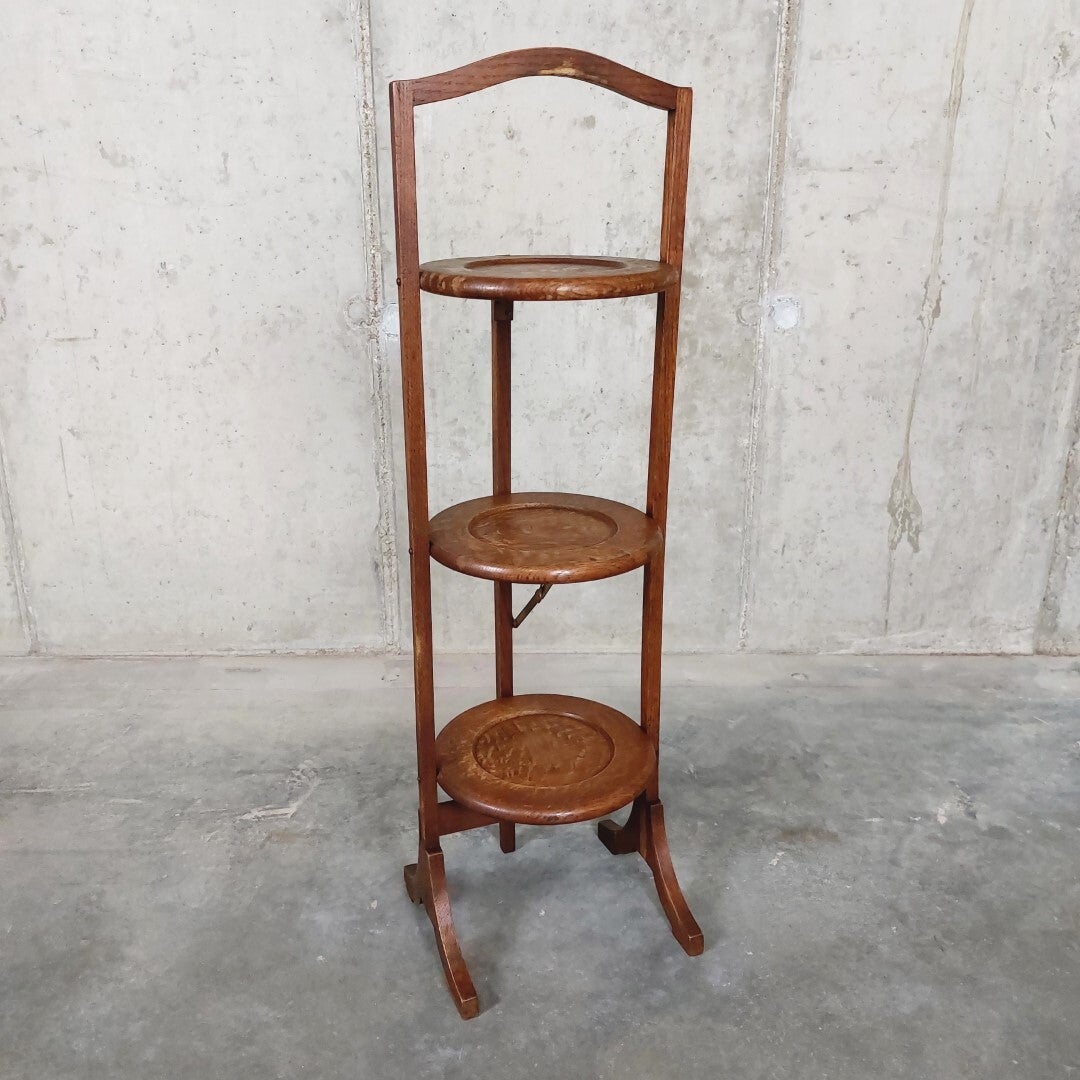 Charmante Engelse cakestand in hout met 3 etages, uit de eerste helft van de 20e eeuw. Een knap bijzetmeubel dat naast het presenteren van gebakjes bijvoorbeeld ook als plantentafeltje gebruikt kan worden. En je kan het ook dichtvouwen om het zo gemakkelijk op te bergen. In goede staat met een mooie patine.