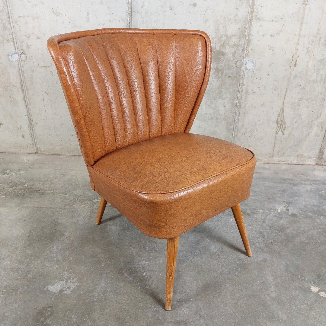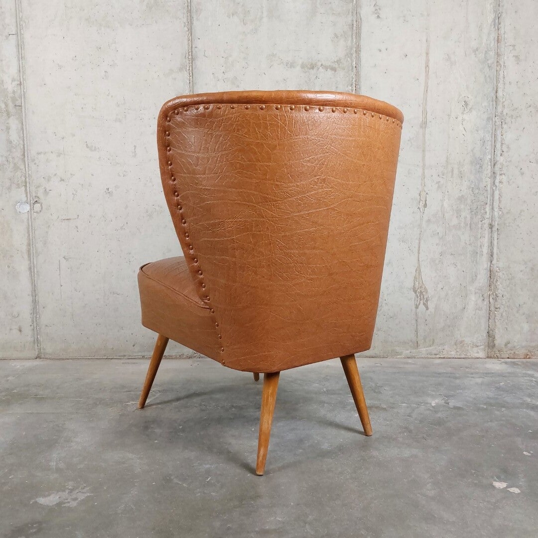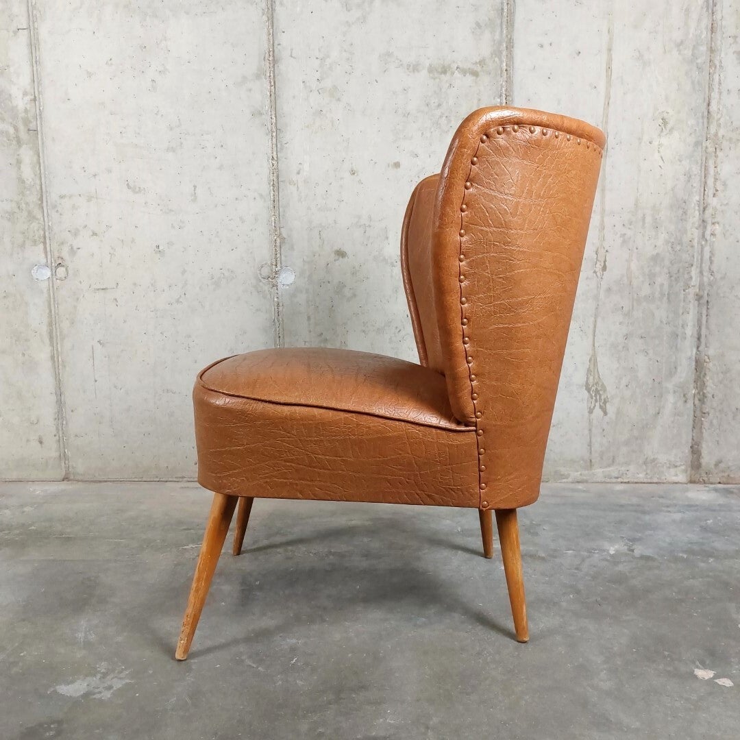 Tijdloos cool en hip zijn ze, die cocktailzeteltjes uit de jaren '50 - '60 (ook wel expo zetels genoemd). Dit authentieke vintage zeteltje heeft nog z'n originele kunstlederen bekleding in cognackleur, afgewerkt met siernagels, en heeft de klassieke schuine en taps toelopende poten. De brede rugleuning en stevige zitting zorgen voor een zeer aangenaam zitcomfort. Een groovy iconische blikvanger, in uitstekende staat.