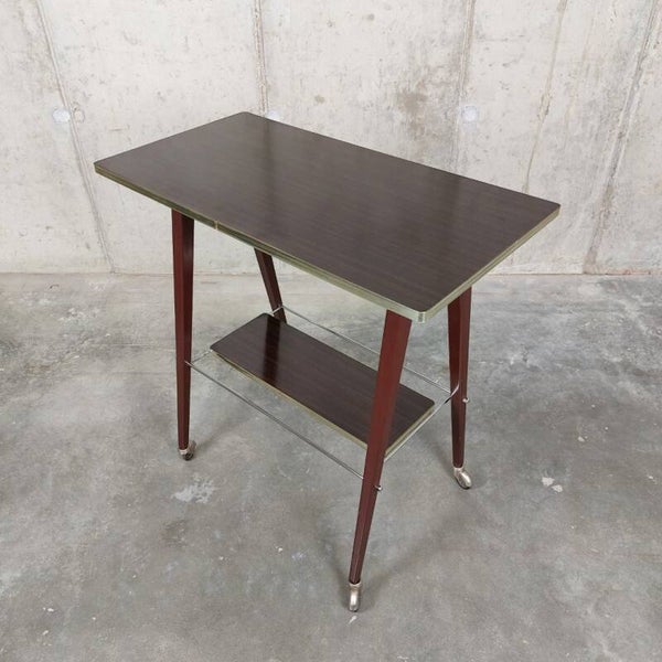 Funky vintage TV-tafel uit de jaren '60, met knappe strakke vormen. De tafel heeft bruin gelakte metalen poten afgewisseld met chromen dwarsstangen, en de bladen zijn afgewerkt met formica met houtmotief en goudkleurige randen. In goede vintage staat met lichte gebruikssporen en wat sporen van oxidatie op de wielen.