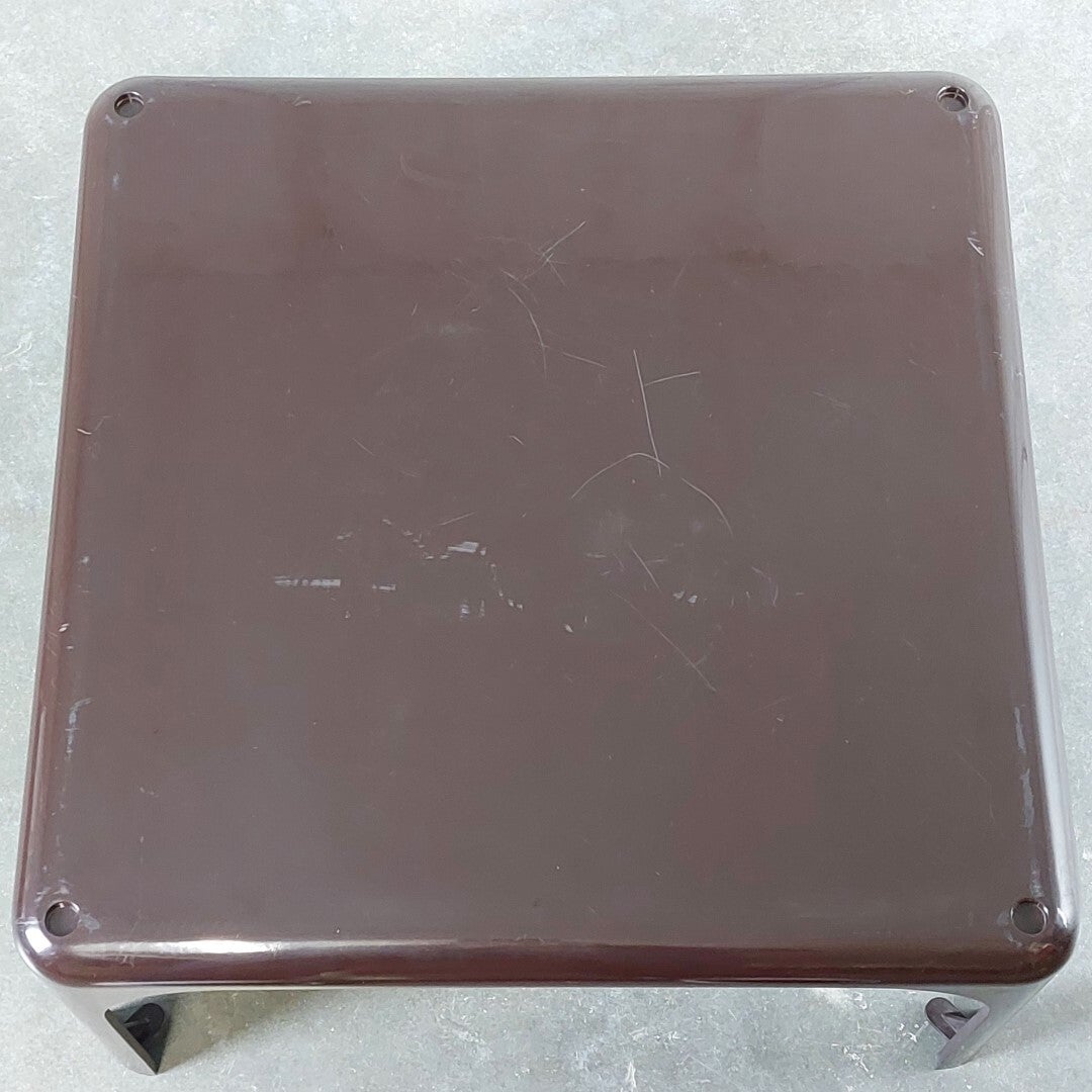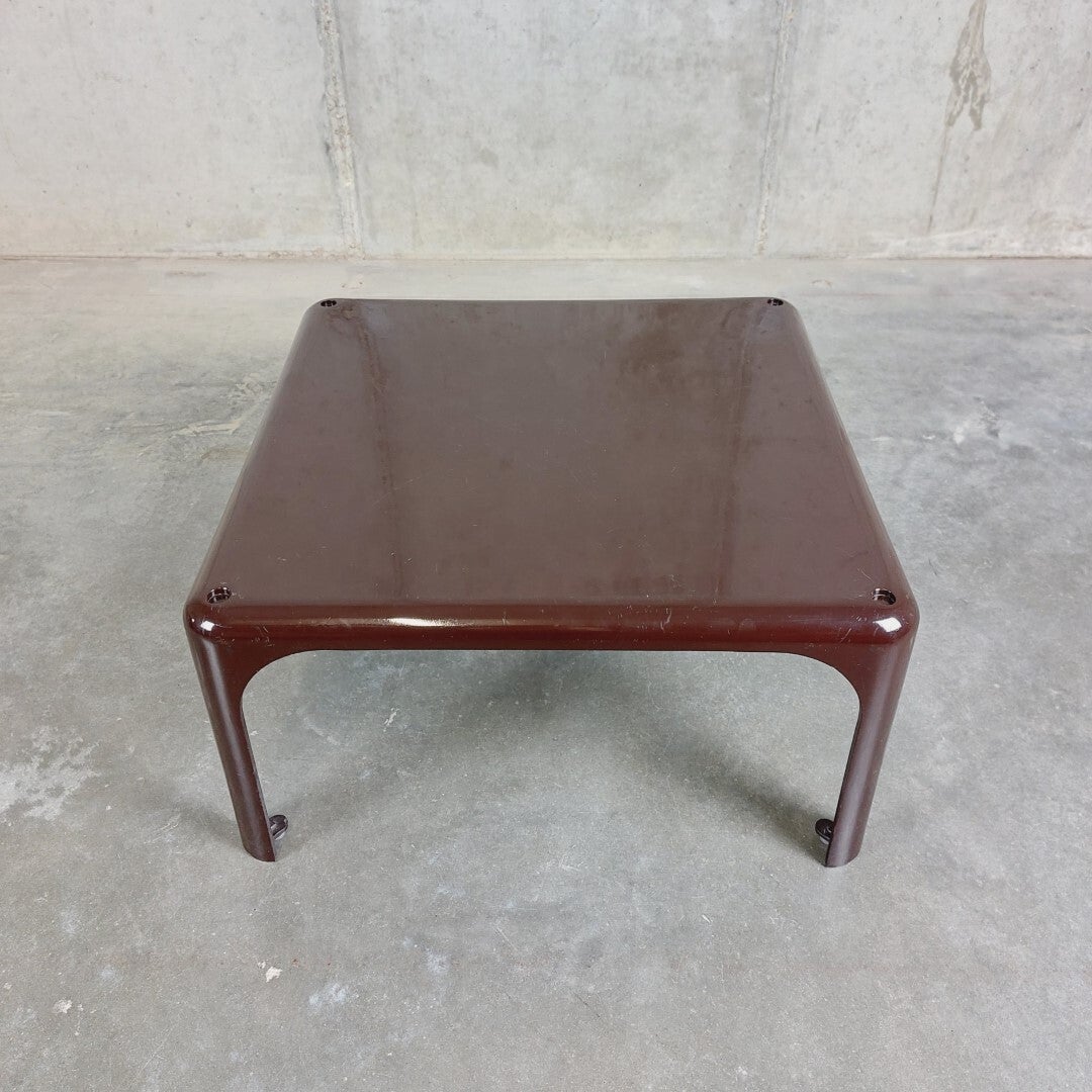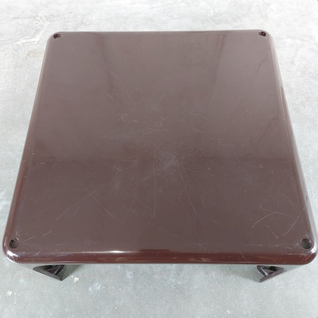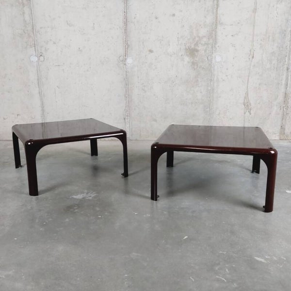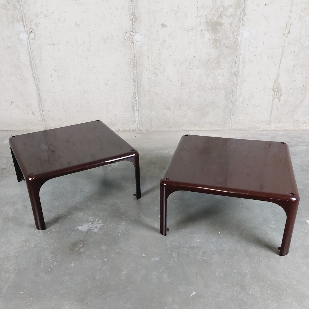 Deze stapelbare bijzettafels, genaamd Demetrio 45, werden ontworpen in 1966 door de bekende architect en designer Vico Magistretti voor Artemide, en ze staan ook in de permanente collectie van het MOMA in New York. Vintage Italiaans design, eenvoudig maar stijlvol, en functioneel, de tafels kunnen los als bijzettafel staan en ook op elkaar gestapeld worden. Ze zijn gemaakt van kunststof, en zijn gemerkt onderaan. Deze donkerbruine exemplaren zijn in goede vintage staat, met krassen als typische ouderdomssporen. Er ontbreekt bij beide tafels telkens één dopje aan de poten, maar dit heeft geen invloed op de stabiliteit.