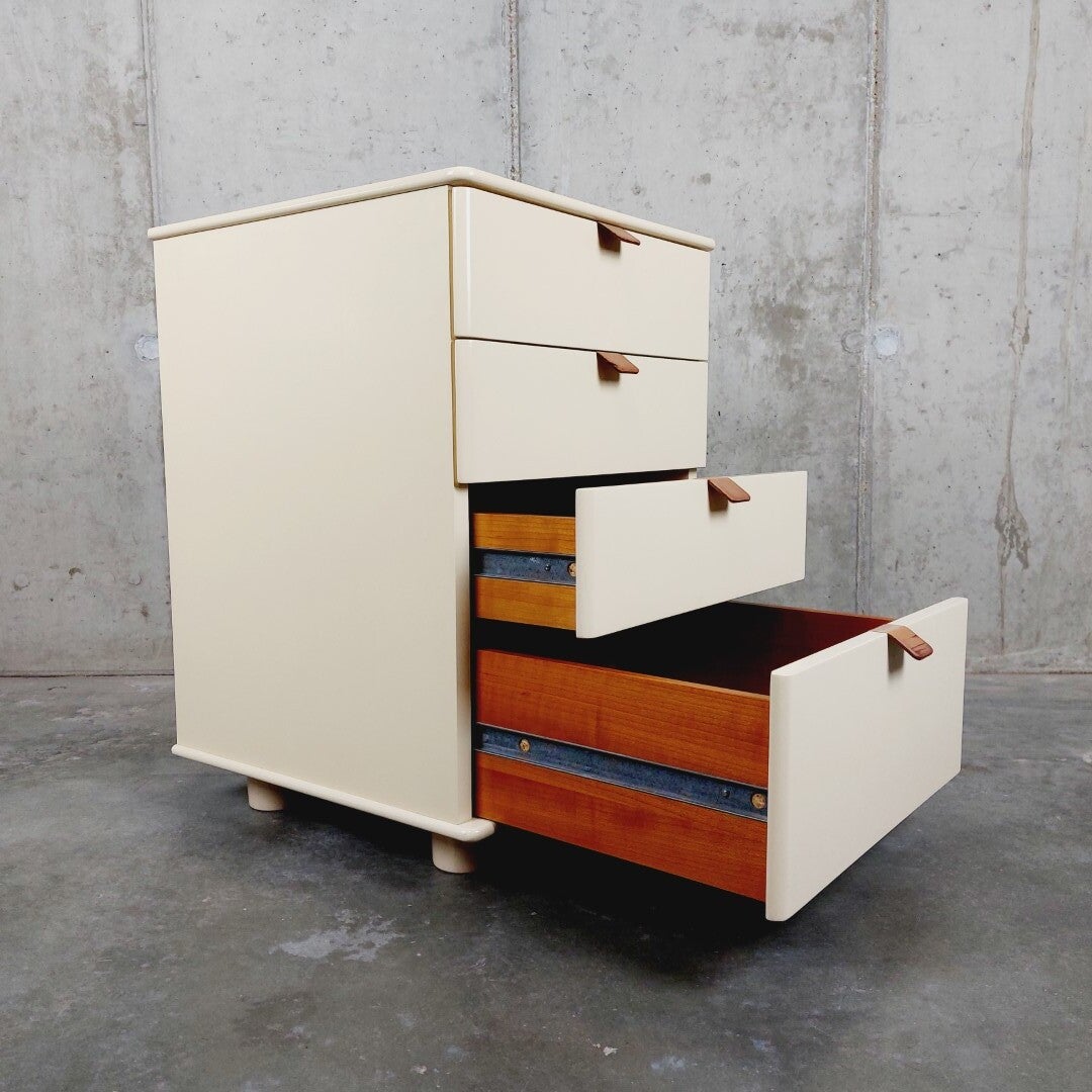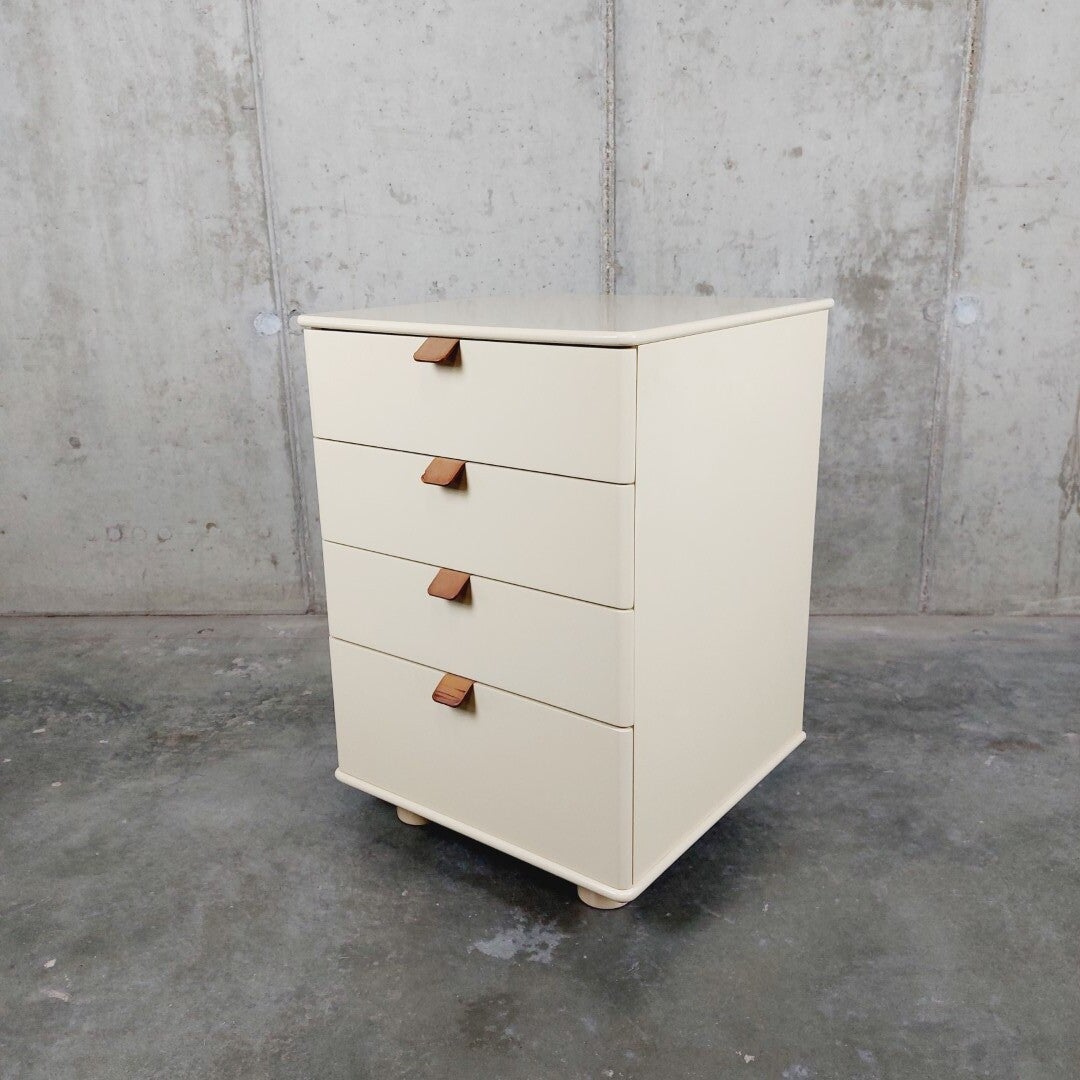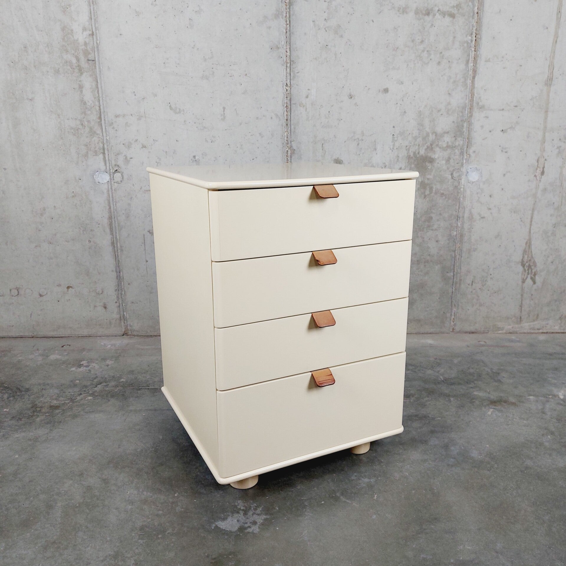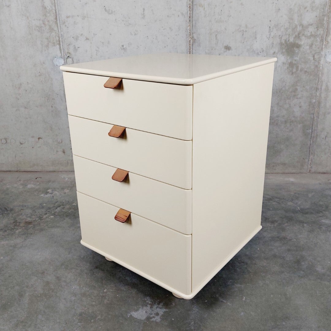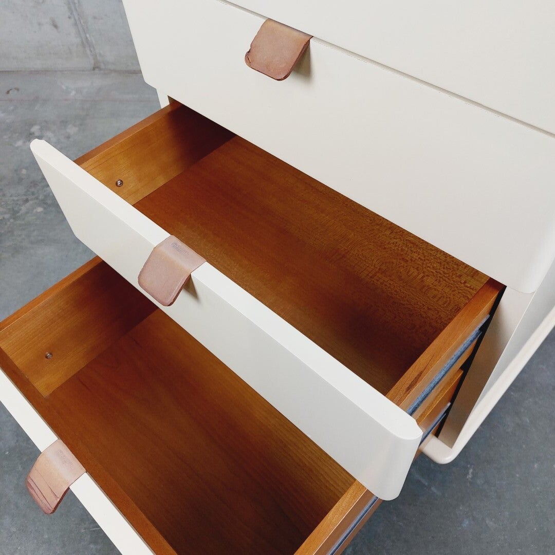 Mooie ladekast uit de 'Mutaro' lijn, ontworpen door Peter Maly voor Interlübke in de jaren '70. Tijdloos minimalistisch design en kwalitatief afgewerkt met hoogwaardige materialen. Dit merk je aan alle details: de stijlvolle afgeronde hoeken, de grote ronde poten, het cognackleurig leder op de handgrepen, ... De ladekast telt 4 lades waarvan de onderste wat groter is, de handgrepen van de lades vertonen wat verwering. De kast is in goede vintage staat met lichte ouderdomssporen, o.a. twee oppervlakkige haarlijn scheurtjes, en een lichte beschadiging aan het leder van één van de handvaten.