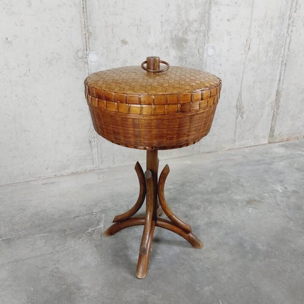 Prachtige en zeldzame garenmand / naaimand op voet uit de jaren '60 of '70. De mand is in geweven riet en heeft een deksel met een knap geometrisch motief, de voet en het handvat zijn van manou (donkere rotan). Een mooi en sfeervol opbergmeubeltje, en in uitstekende vintage staat (enkel het deksel klemt wat).