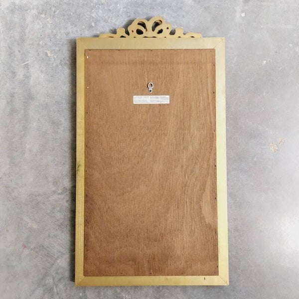 Mooie spiegel met antieke look van het Belgische Deknudt uit de jaren '60. Het spiegelglas heeft geslepen randen en de lijst is afgewerkt met vergulde decoratieve elementen en vergulde gedecoreerde boorden met een groene strook ertussen. In heel goede vintage staat met lichte ouderdomssporen. Er is een barstje in de decoratie bovenaan de spiegel, maar dit valt niet op.