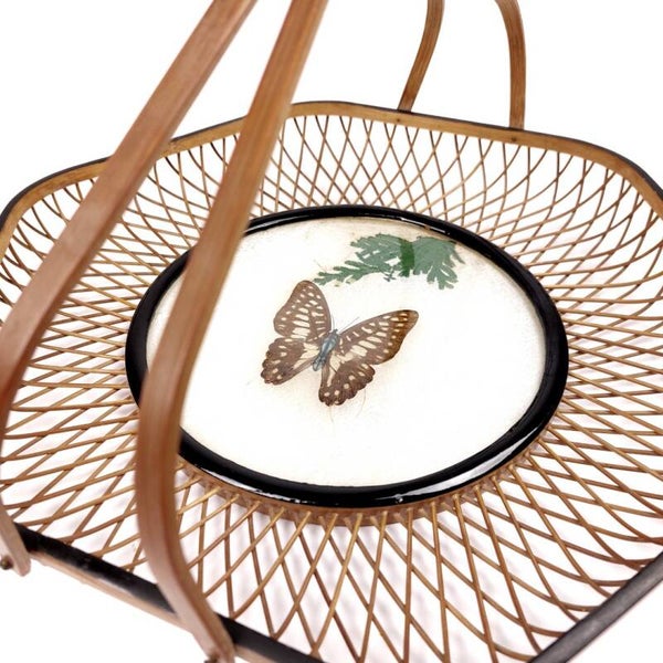Elegant houten mandje met handvat in Scandinavische stijl, met middenin mooi inlegwerk van een vlinder. Het inlegwerk zit tussen glas en is versierd met wat groen en een licht gemarmerde achtergrond. Het mandje is gemaakt van knap gevlochten houtwerk en afgewerkt met zwarte randen. In heel goede vintage staat met lichte ouderdomssporen.