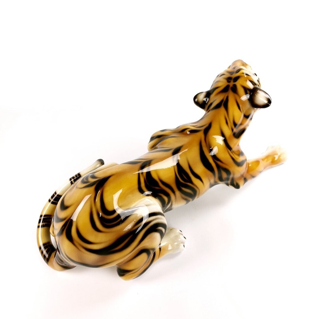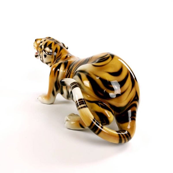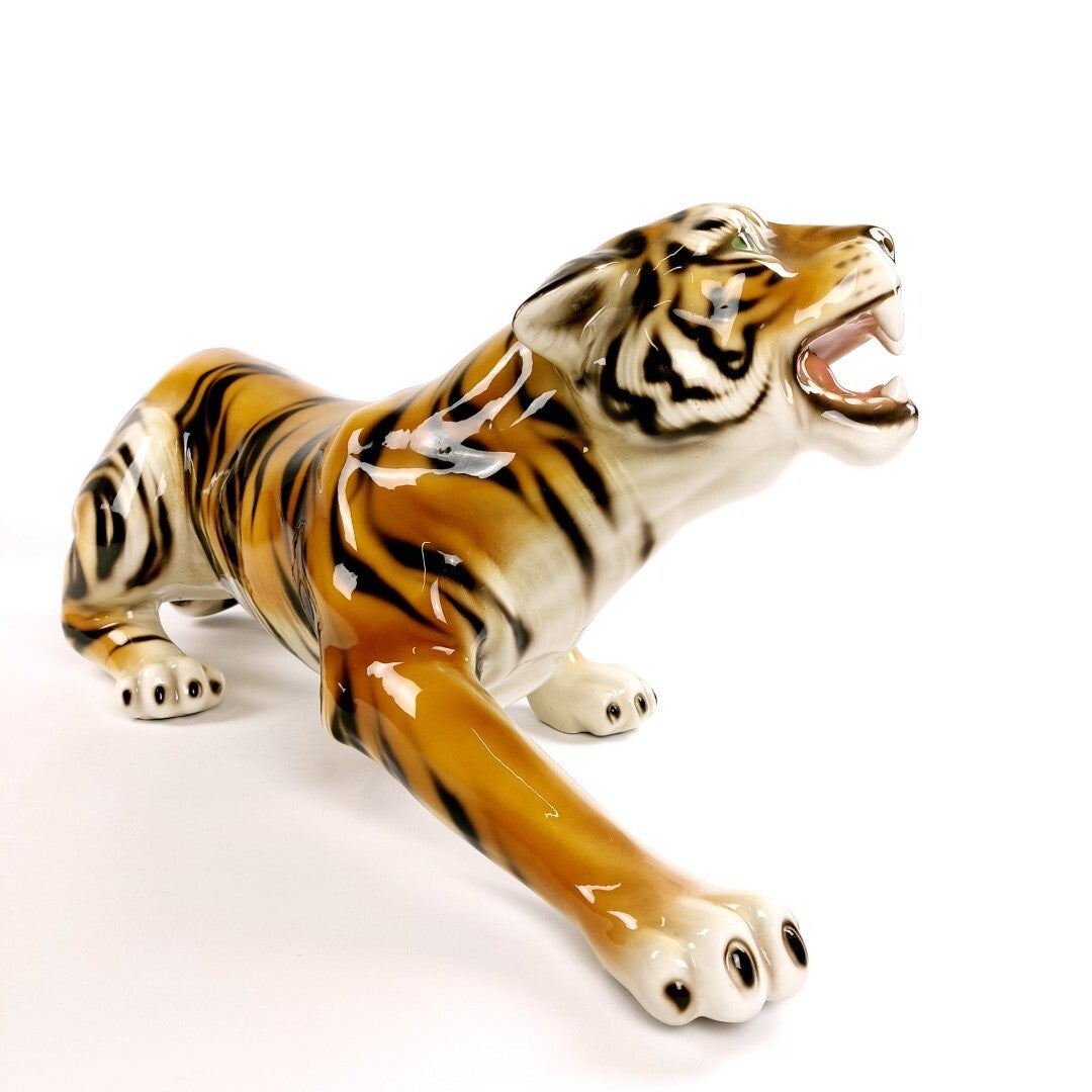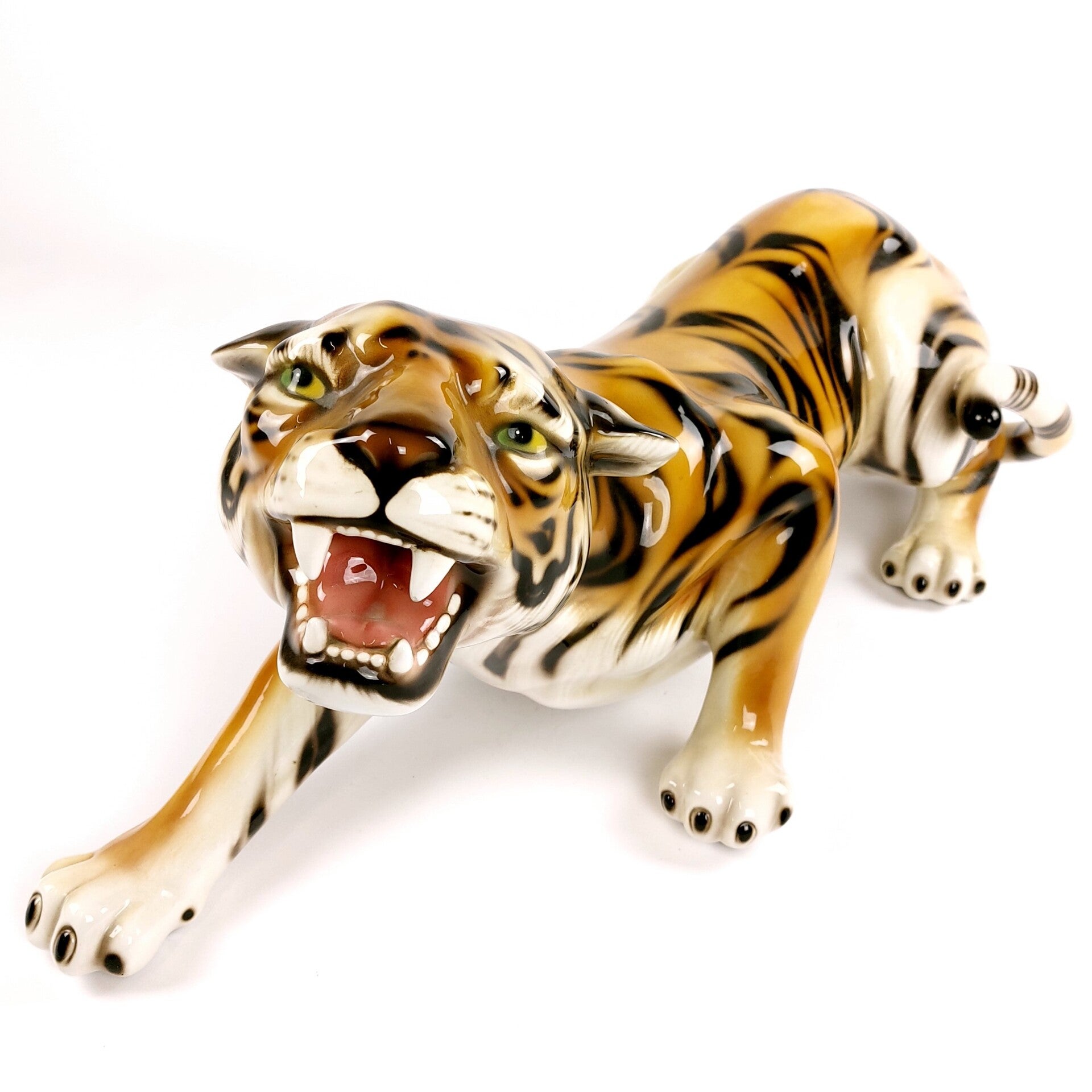 Prachtige en majestueuze tijger in keramiek. De sluipende houding en realistische vormgeving maken van deze grote kat een werkelijk indrukwekkende eyecatcher. Het beeld is Portugees van oorsprong en dateert uit de jaren '70 - '80. In perfecte staat.