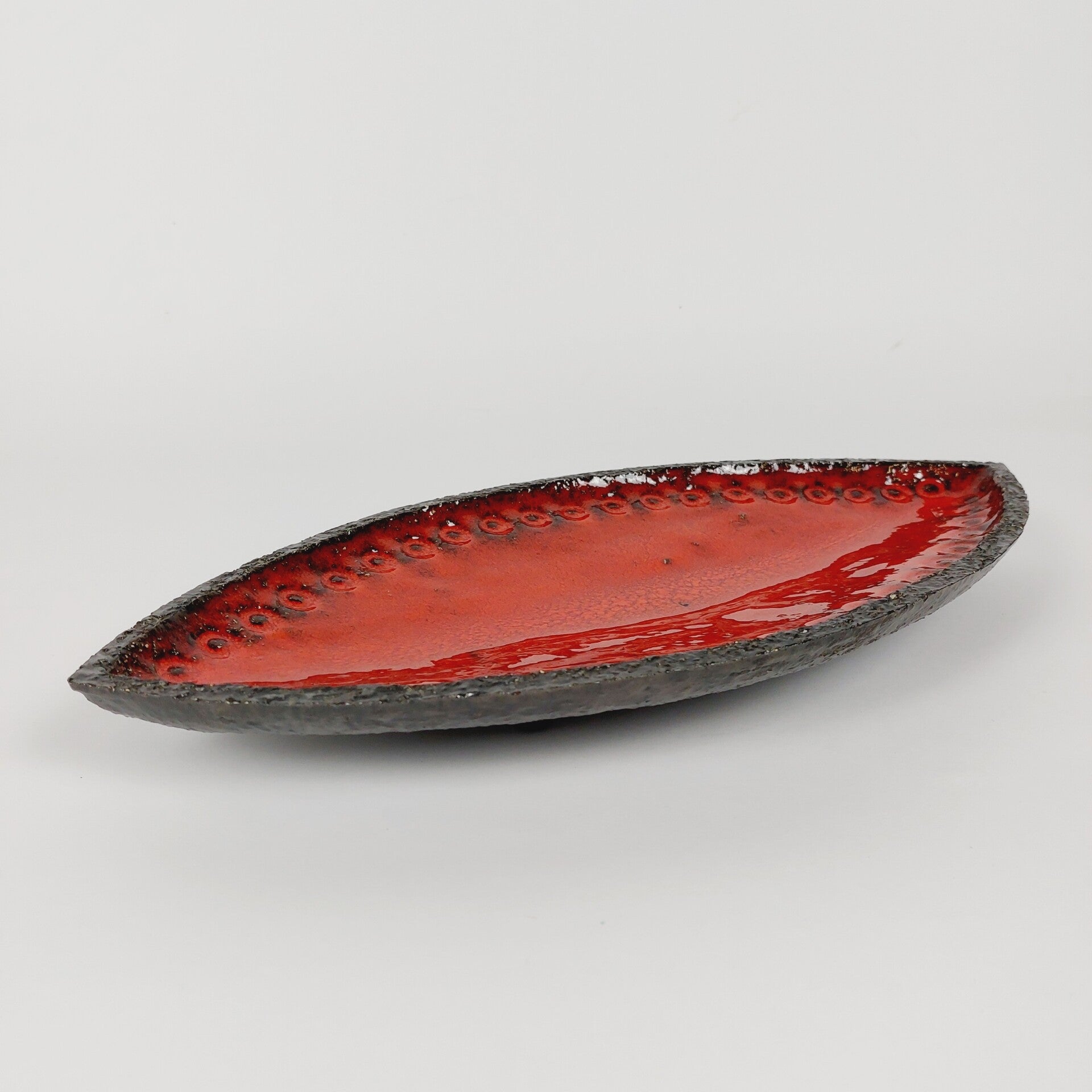 Deze knappe schaal in keramiek, in Perignem stijl, dateert uit de jaren '70 en is getekend 'Talboom'. Onderaan zwarte fat lava, en bovenaan afgewerkt met een prachtige dieprode glazuur. In uitstekende staat.
