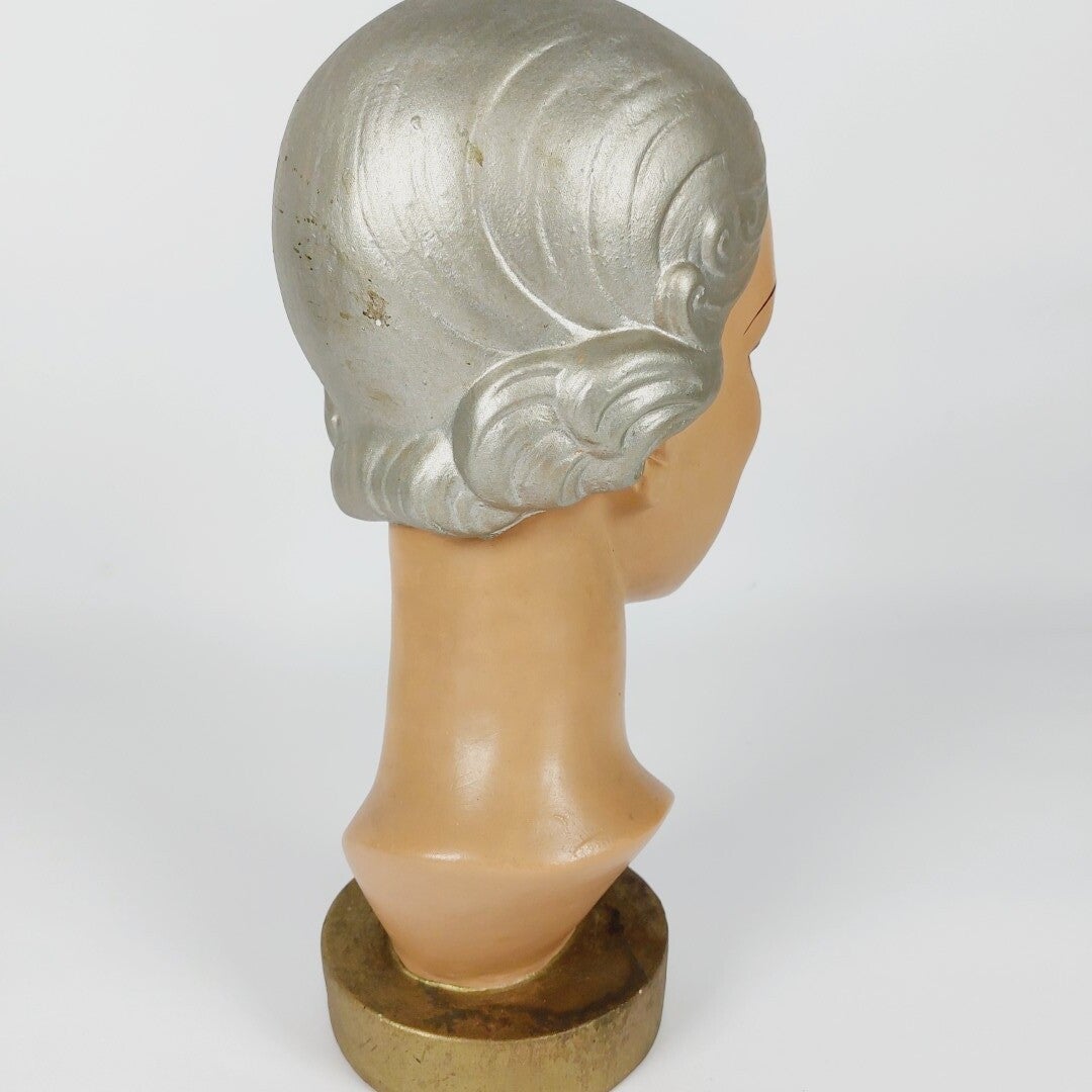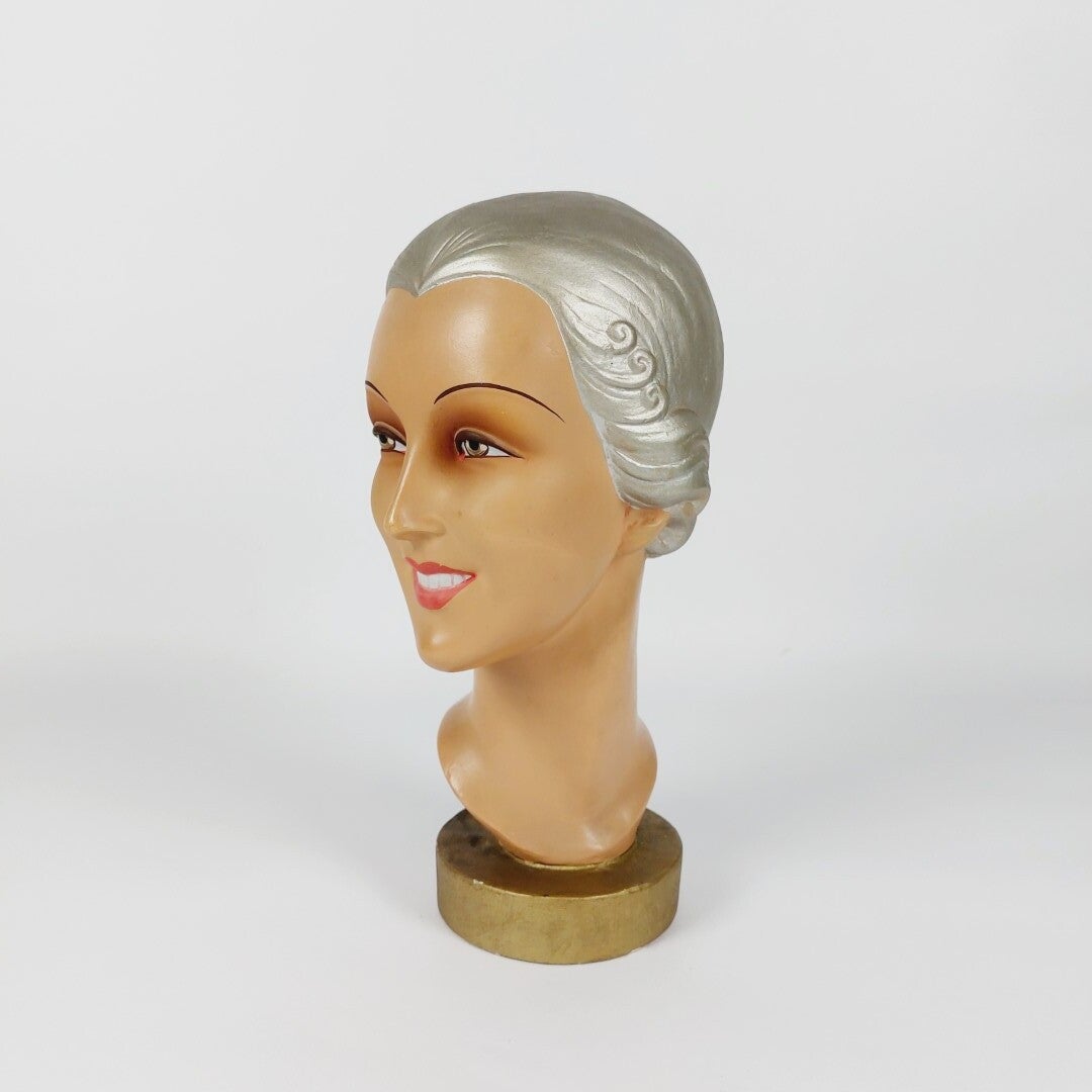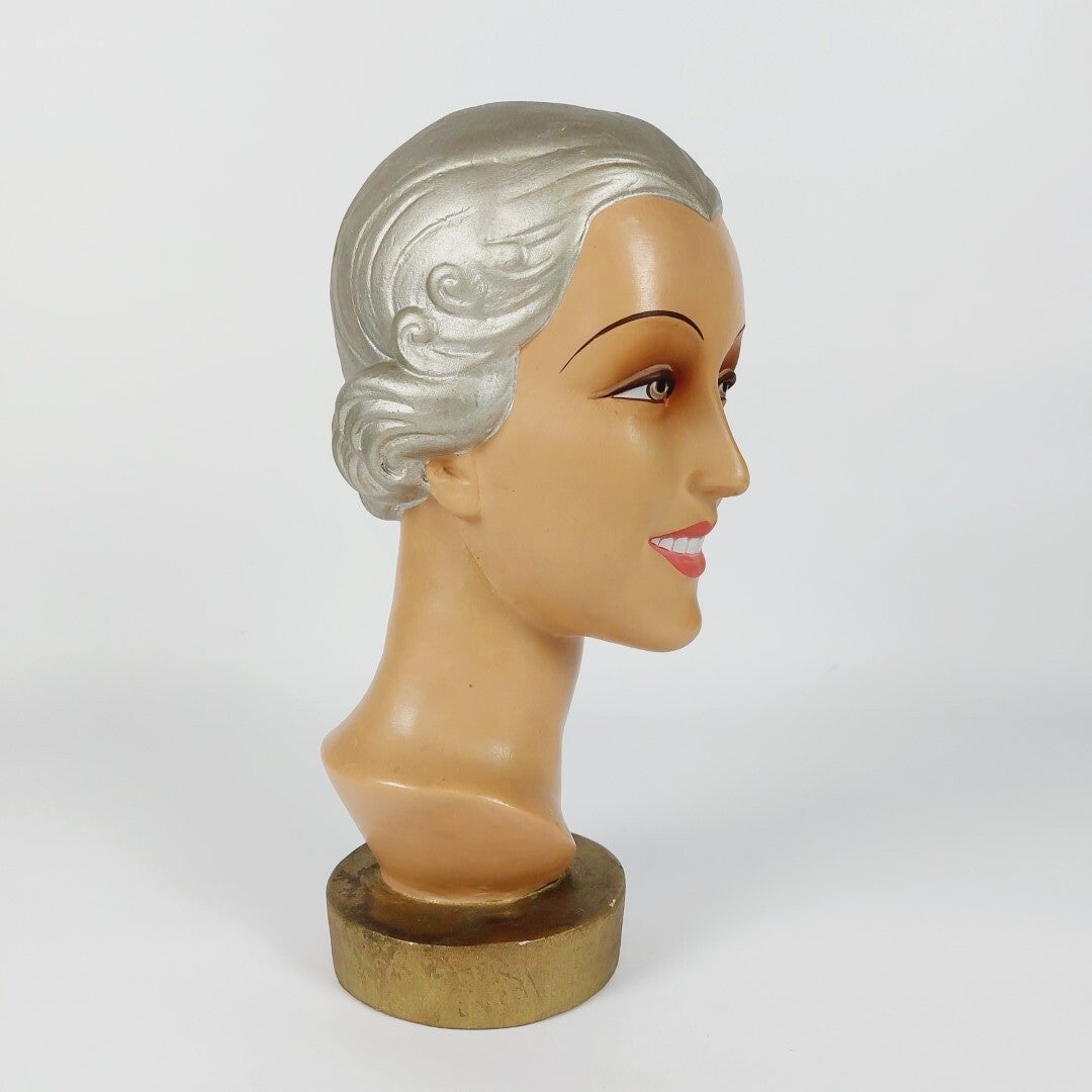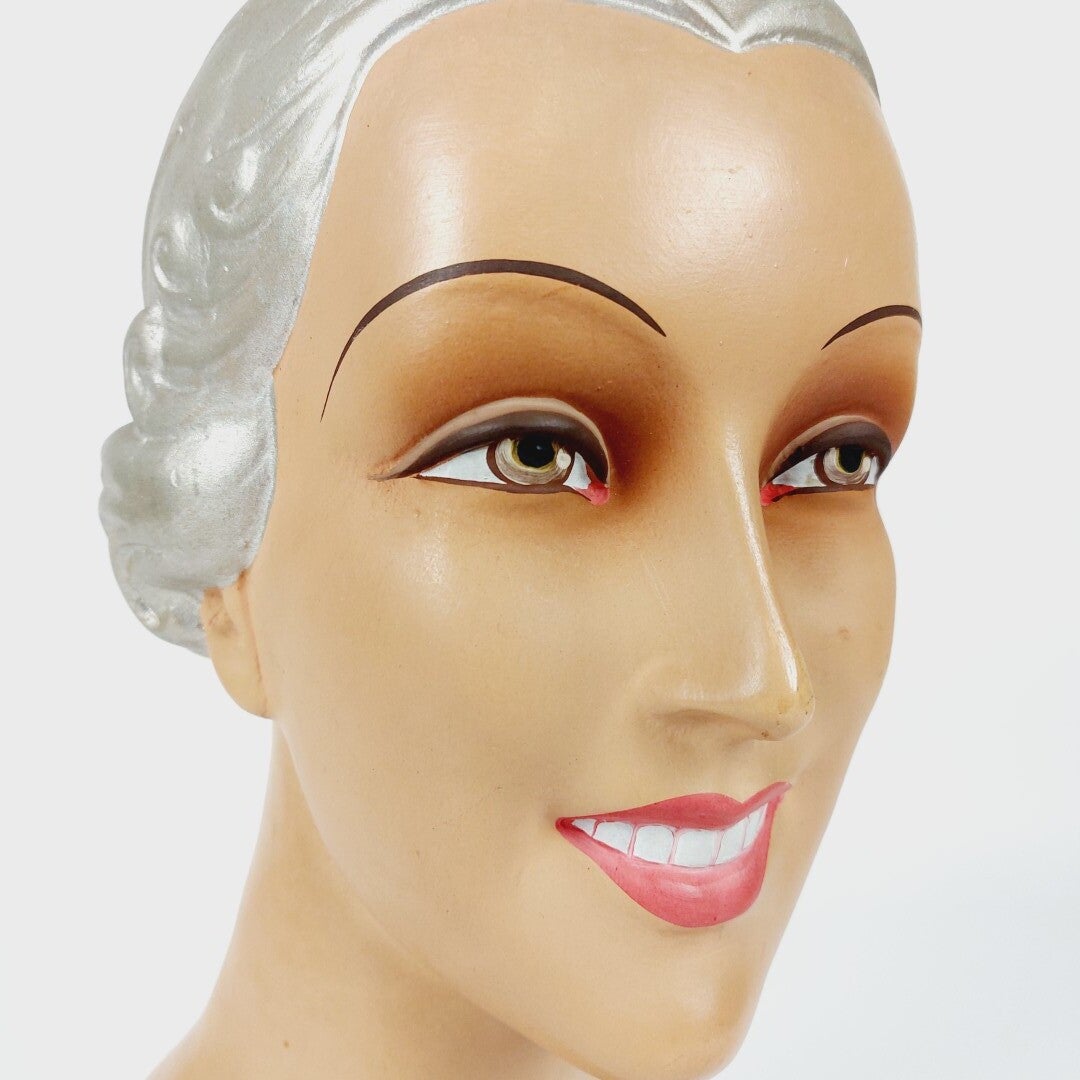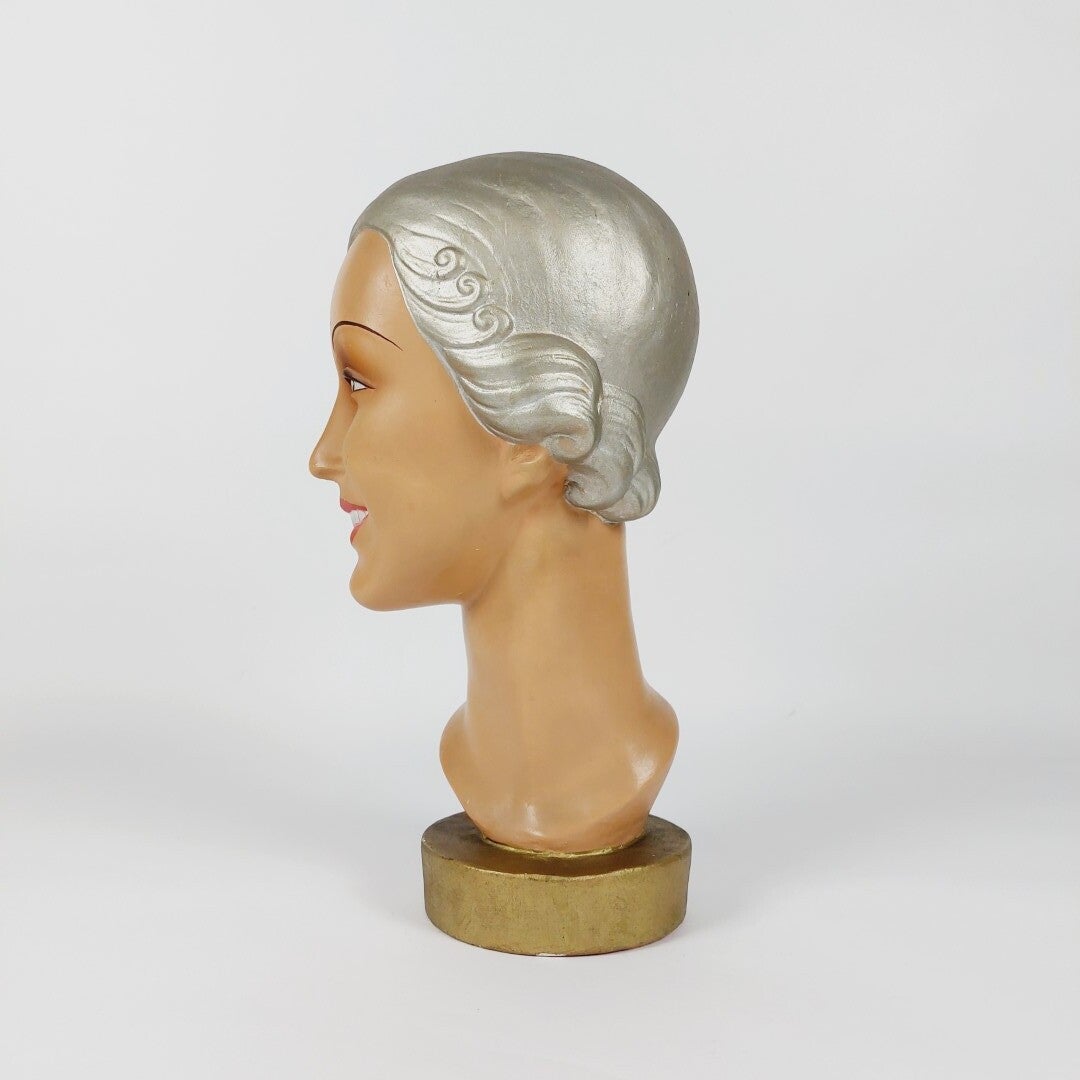Knap mannequin hoofd met zilverkleurig haar uit de art deco periode, eerste helft van de 20e eeuw. Deze bustes, die net zoals deze meestal uit plaaster waren gemaakt, werden vaak gebruikt door winkeliers om hoofddeksels, sieraden of dergelijke op te presenteren. Het beeld is in heel goede vintage staat met lichte ouderdomssporen conform de leeftijd.