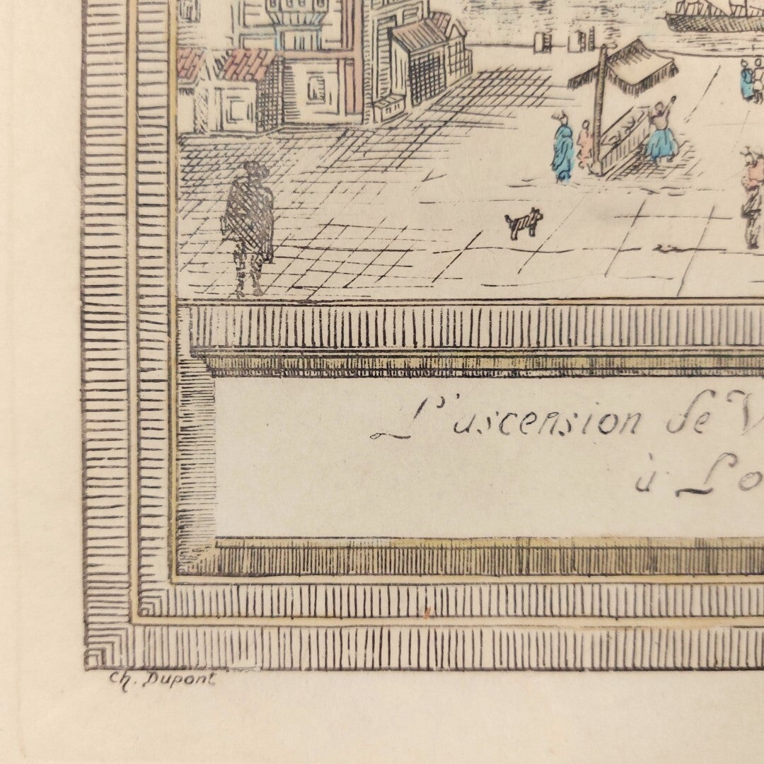 Charmante en sfeervolle ingekleurde litho van Charles Dupont, getiteld 'L'ascension de Vincent Lonardi, Venitien à Londres, 1784'. Het betreft een herdruk uit de eerste helft van de 20e eeuw van een origineel werk uit 1790. Het werkje is heel mooi ingekaderd en is in goede staat, lichtjes verkleurd maar dit geeft het net zo'n mooie patine. Zeer mooi in combinatie met de andere litho uit deze reeks.