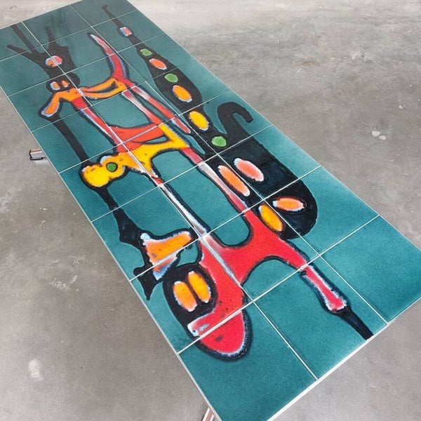 Knappe salontafel uit de jaren '60 van de Belgische keramiek kunstenaar Adri. Het bovenblad met keramische tegels heeft een prachtig abstract decor met warme kleuren. De voet in chroom is afgewerkt met mooie fineer details. De tafel is in heel goede vintage staat, met lichte ouderdomssporen eigen aan de leeftijd.