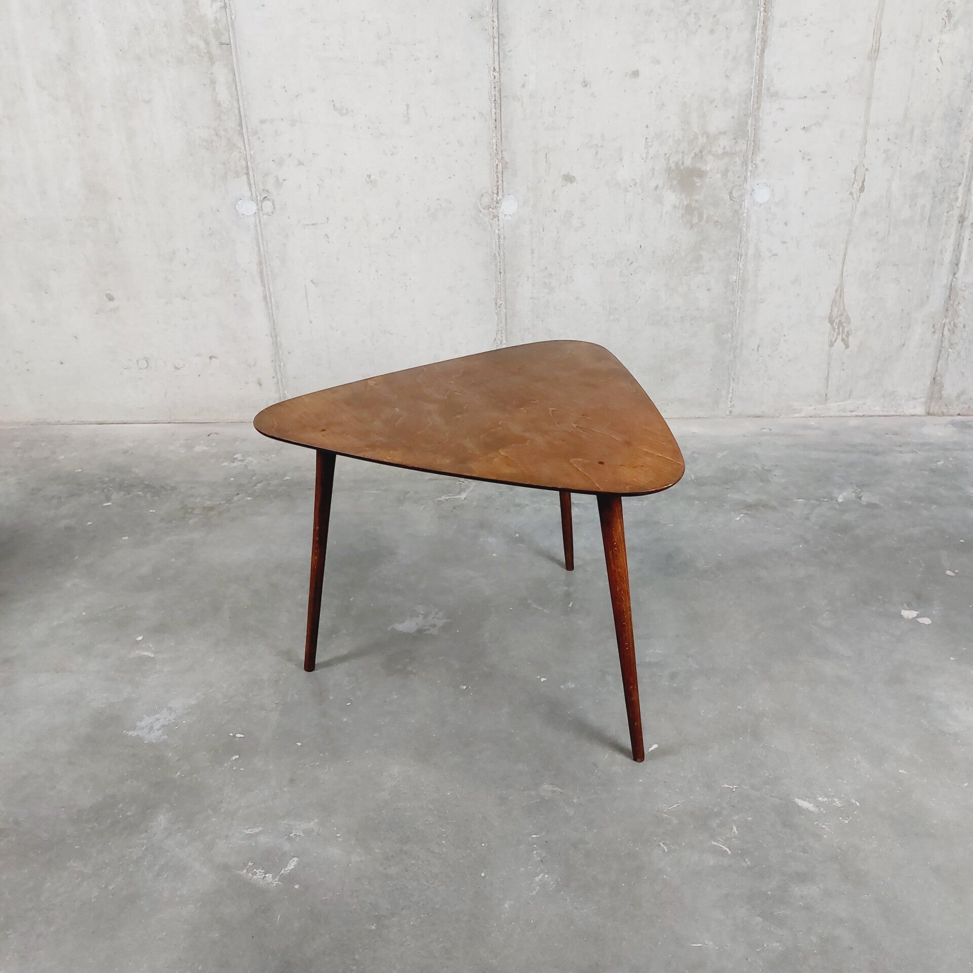 Vintage tripod bijzettafeltje uit de jaren '60 - '70, met een knappe vorm en zeer mooie houtkleur. Het tafeltje is in goede vintage staat met lichte ouderdomssporen.