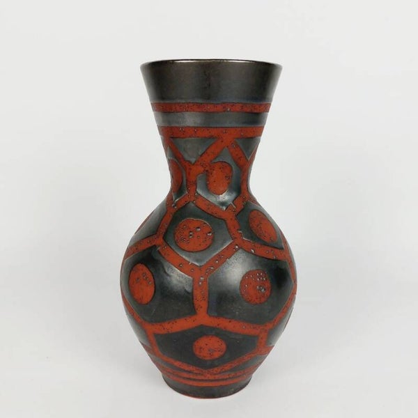 Vintage 60's vaas in keramiek uit de 'Ankara' serie van Helmut Scholtis voor Carstens Tönnieshof. De vaas is afgewerkt met een knappe donkere metallic glazuur met roestbruin decor. In perfecte staat.