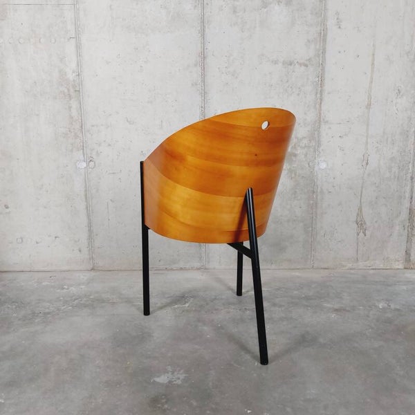 Deze iconische stoel werd begin jaren '80 ontworpen door Philippe Starck, specifiek voor het Parijse Café Costes, en geproduceerd door het Italiaanse Driade. Een tijdloos en elegant design, met een buisvormige zwart gelakte basis, rugleuning in multiplex afgewerkt met mooie mahonie fineer, en zwarte lederen zitting. Deze prachtige set armstoelen is in uitstekende vintage staat, met minimale ouderdomssporen.