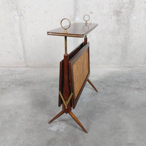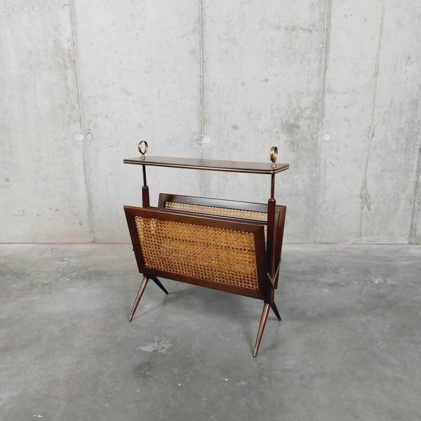 Elegant magazinerek uit de jaren '50 van de Italiaanse ontwerper Ico Parisi. Een prachtig en stijlvol bijzetmeubel in mooi mahonie hout, met cannage afgewerkte zijkanten, en messing details. De zijkanten kunnen ook dichtgevouwd worden. In uitmuntende staat, enkel wat lichte oxidatiesporen op de messing elementen.