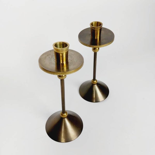 Koppel postmodernistische kandelaars uit de jaren '80. Met hun knappe design in de stijl van Christian de Beaumont, en stijlvolle afwerking in brons en messing vormen ze een perfect accessoire voor elk vintage en modern interieur. In goede staat met een mooie patine.