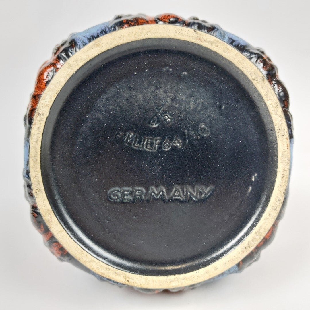 Fantastische West-Germany keramiek vaas van Dümler & Breiden uit de jaren '60. Een echte eyecatcher met z'n uitzonderlijke en zeldzame vorm, en prachtig afgewerkt met het blauw-rode 'Komet' decor uit de 'Relief' reeks. De vaas is in perfecte staat.