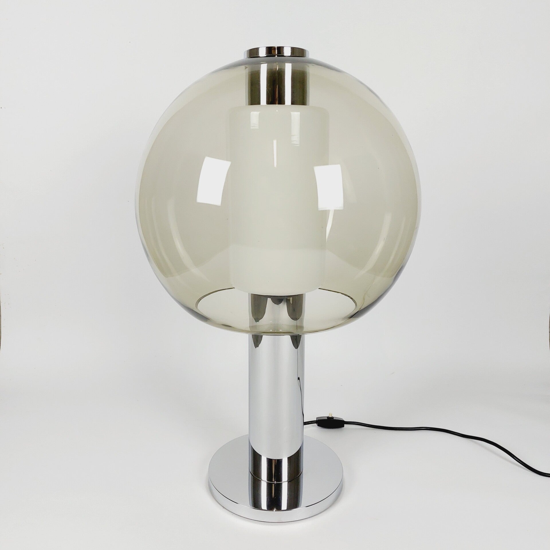 Fantastische en impressionante tafellamp uit de jaren '60. Deze grote tafellamp, die ook als vloerlamp kan staan, heeft een basis in chroom met een diffuser in wit opaline glas. De grote globe in gefumeerd glas dicteert de prachtige vorm van deze lamp. Deze mid-century eyecatcher is in excellente staat.