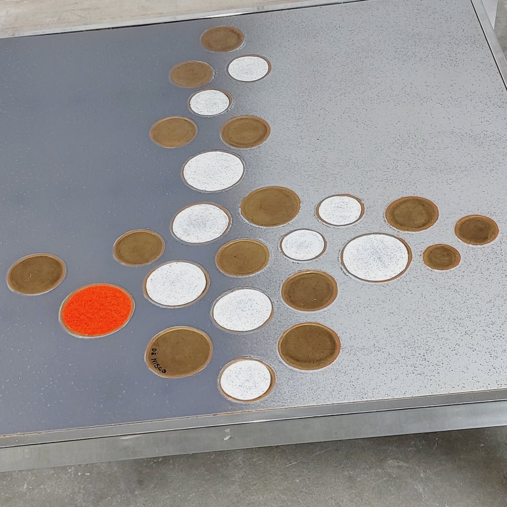Prachtige en zeldzame salontafel uit de jaren '70 van de Belgische ontwerper Denisco. Een bijzondere tafel in vierkante vorm met een schitterend decor. Het in resine gegoten bovenblad in mooie grijstinten is opgeluisterd met een speels en figuratief design, en rust op een stevig chromen metalen frame. De tafel is in zo goed als perfecte staat met minimale ouderdomssporen.