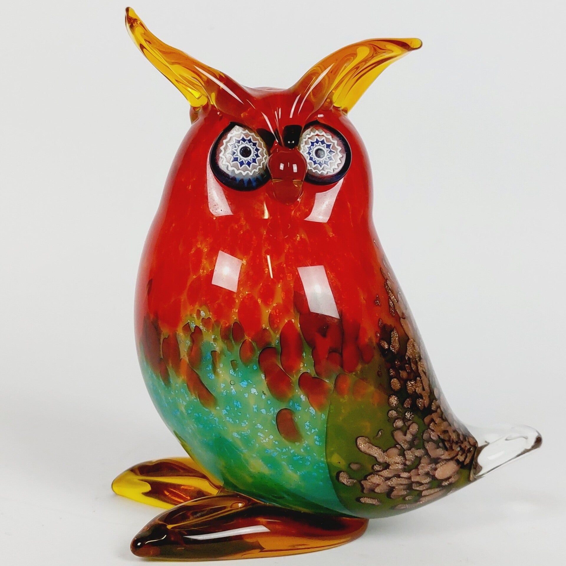 Prachtige Italiaanse uil sculptuur in Murano glas van Franco Moretti. Het beeldje is afgewerkt in een magnifiek kleurenpallet van rode, groene en amber tinten, en vertoont fantastische details zoals de millefiori ogen en gouden vlokken over het lichaam. Een vrij zeldzaam stuk die getuigt van waar vakmanschap. Deze schitterende sculptuur is onderaan getekend door Franco Moretti en is in perfecte staat.
