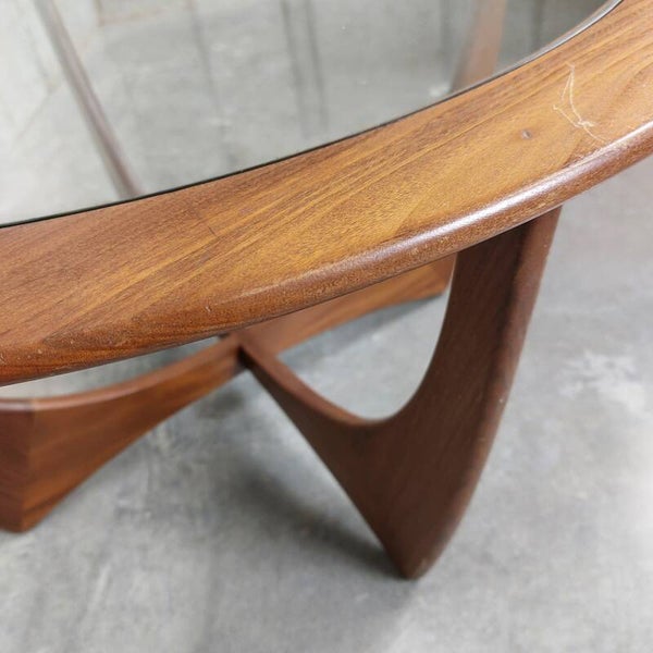 Prachtige vintage salontafel, in de jaren '60 ontworpen door Victor Wilkins voor G Plan als onderdeel van de 'Astro' collectie. G Plan is een gerenommeerd meubelatelier, ontstaan in 1953 in de UK, die bekend staat voor hun kwalitatieve vintage meubelen. Deze tafel is met z'n magnifieke elegante rondingen een ware mid-century design klassieker. De tafel heeft een teak frame en glazen blad, en past door z'n ideale afmetingen in elk interieur. Deze 60's beauty is in heel goede vintage staat met ouderdomssporen eigen aan de leeftijd, enkele schrammen op het houten frame, en het glazen blad vertoont lichte krassen.