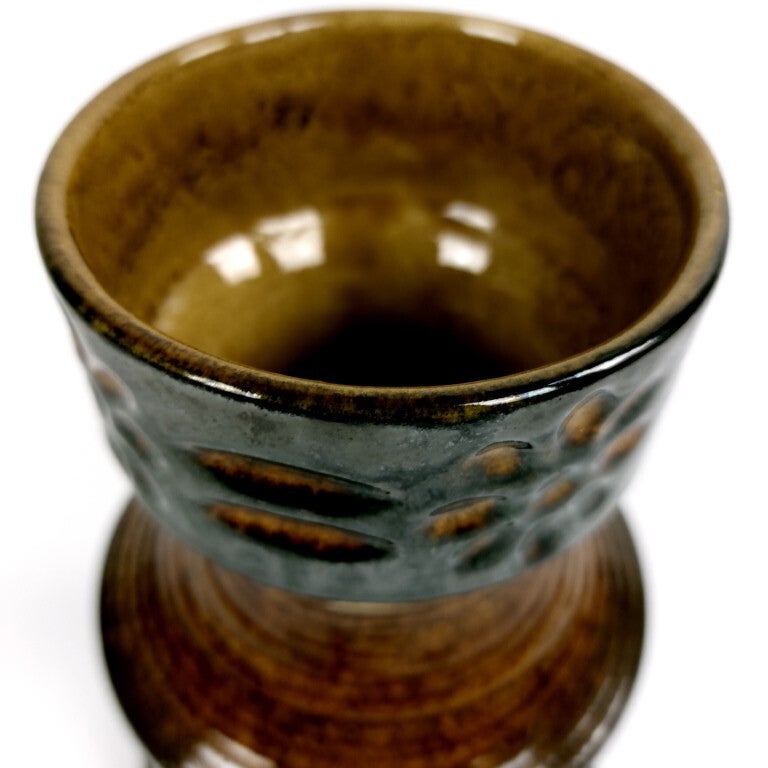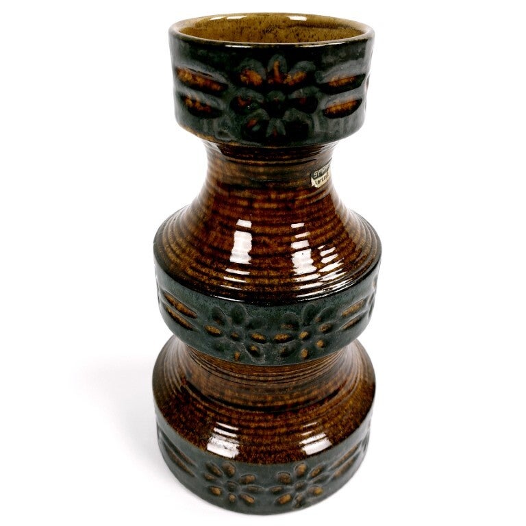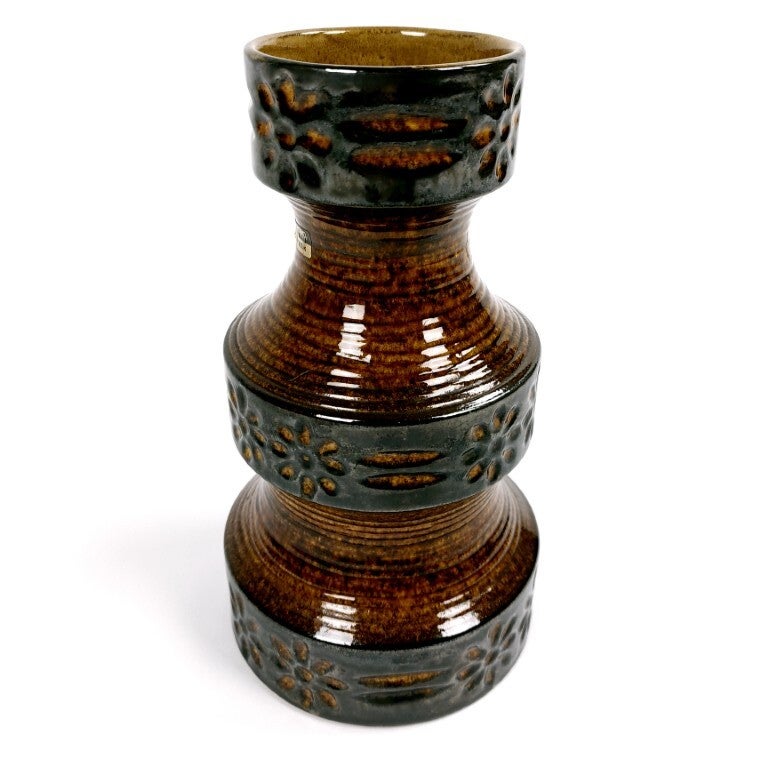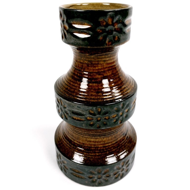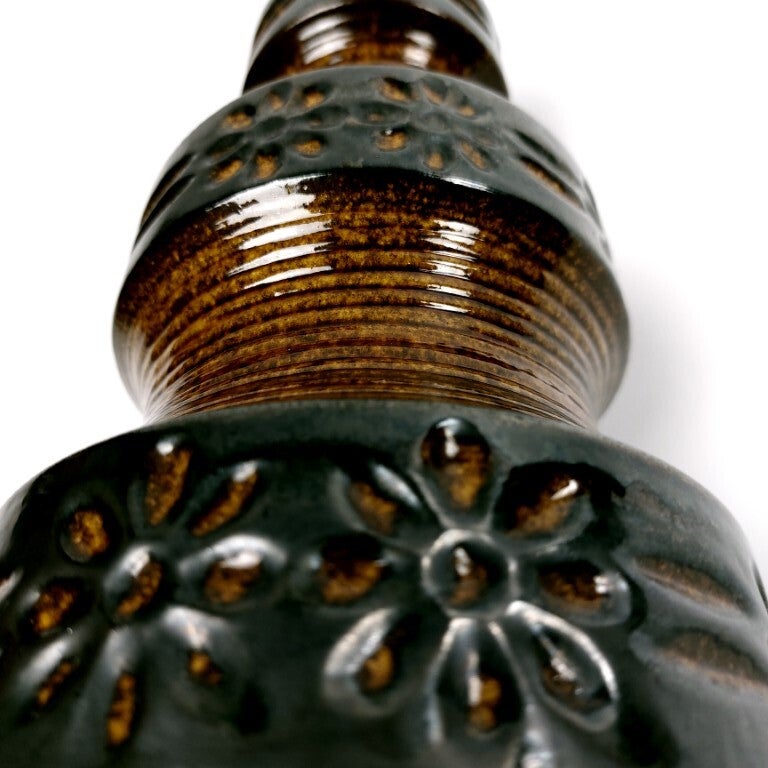 Vintage vaas uit de jaren '60, van het West-Duitse Spara Keramik, gemerkt 581-25. De vaas heeft een bruine glazuur met daarop donkere horizontale stroken met een bloemenmotief in reliëf. De prachtige pagode vorm en warme kleuren maken dit een mooi sfeerstuk. In heel goede vintage staat.
