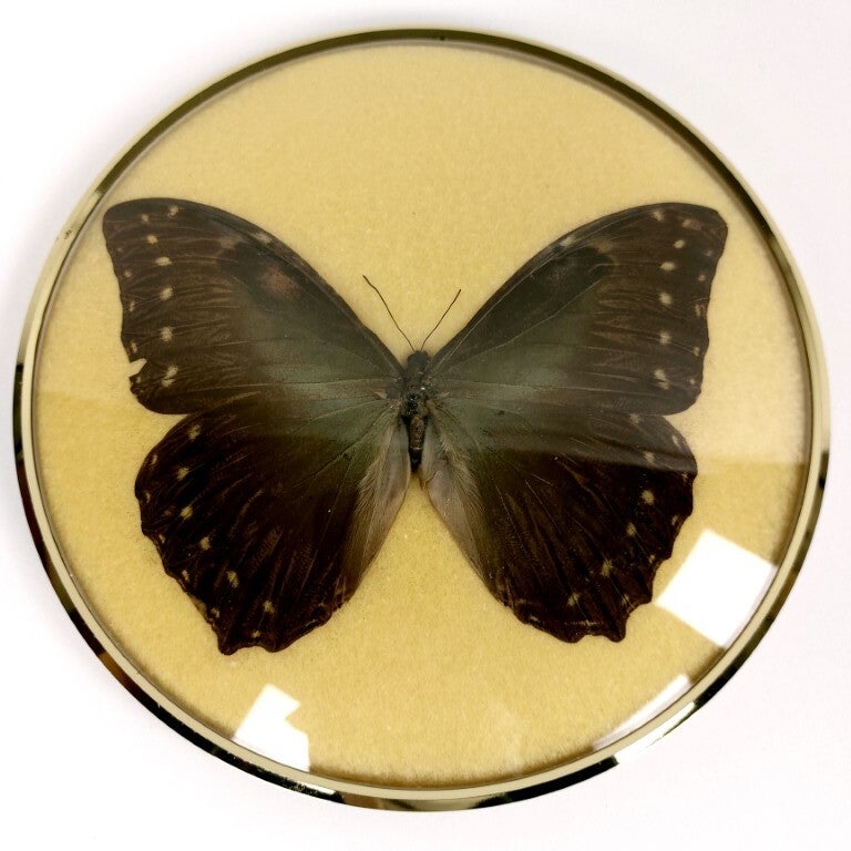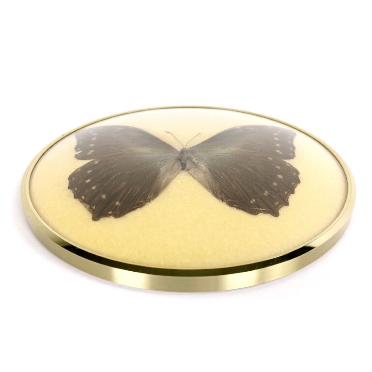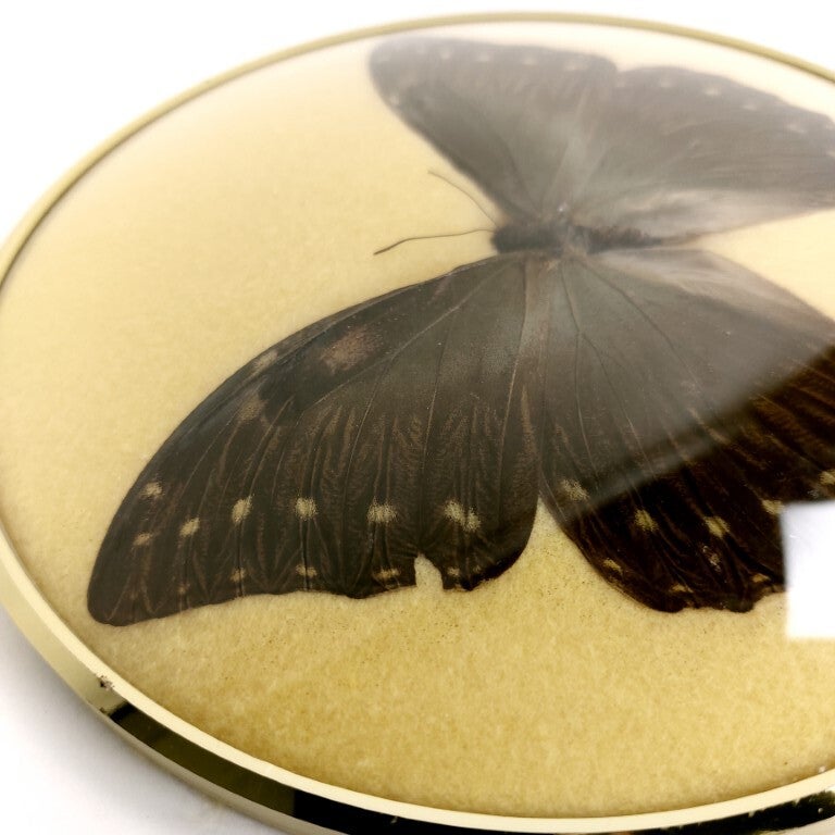 Prachtig vintage rond kader met een opgezette vlinder. Het kader met bombé (bol) glas is verguld en de vlinder ligt op een gele zachte ondergrond. Heel stijlvol ingekaderd, en in quasi perfecte staat (er is één klein roestvlekje aan de rand van het kader).