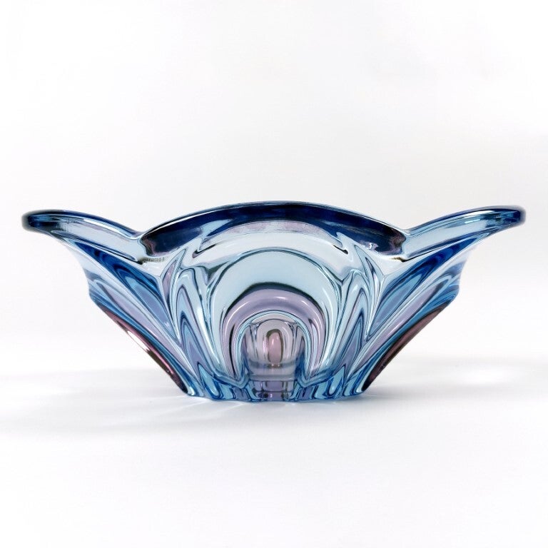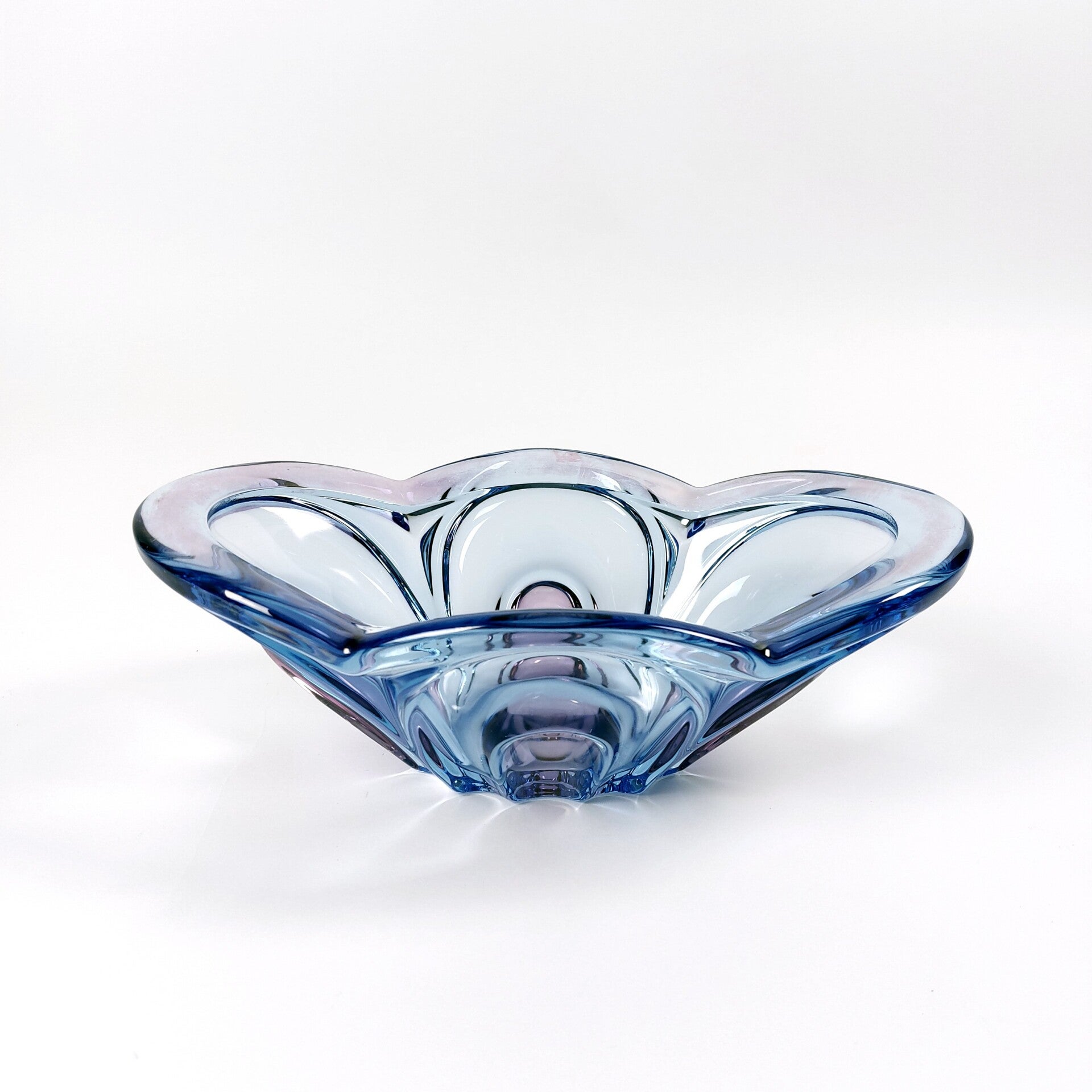 Prachtige schaal van Murano glas uit de jaren '60. Het diep uitgesneden gelobde ontwerp van de schaal is in art deco stijl, en de combinatie van blauwe en roze kleuren is schitterend. In de roze elementen zijn ook goudtinten verwerkt (jammer genoeg is dit niet op foto vast te leggen), wat naargelang de lichtinval voor een prachtig en afwisselend kleurenpallet zorgt. In perfecte staat.