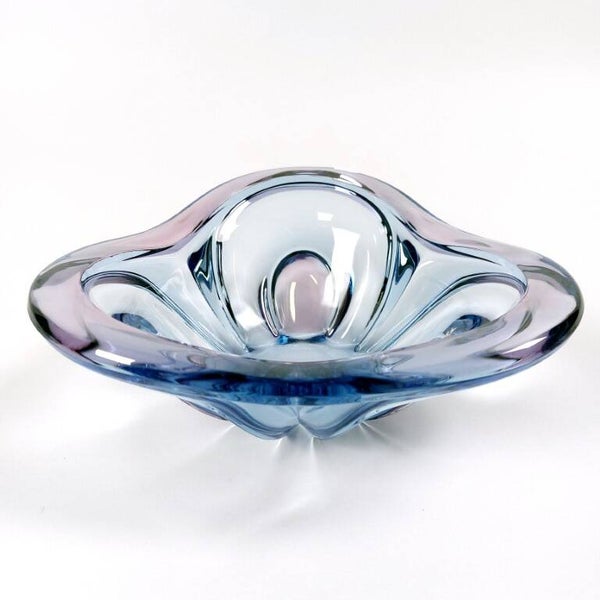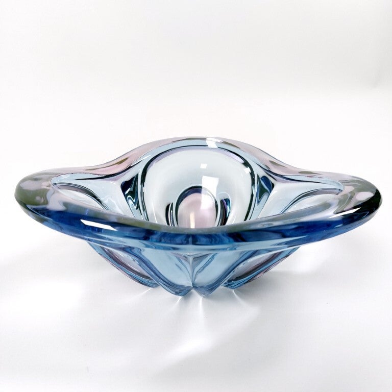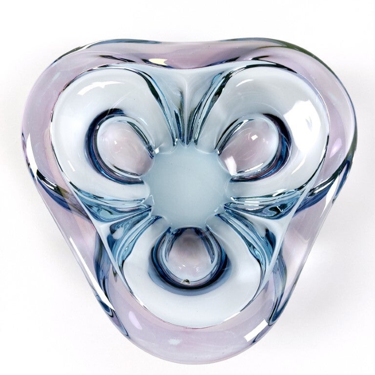 Mooie driehoekige schaal van Murano glas uit de jaren '60. Het diep uitgesneden gelobde ontwerp van de schaal is in art deco stijl, en de combinatie van blauwe en roze kleuren is schitterend. In de roze elementen zijn ook goudtinten verwerkt (jammer genoeg is dit niet op foto vast te leggen), wat naargelang de lichtinval voor een prachtig en afwisselend kleurenpallet zorgt. In perfecte staat.