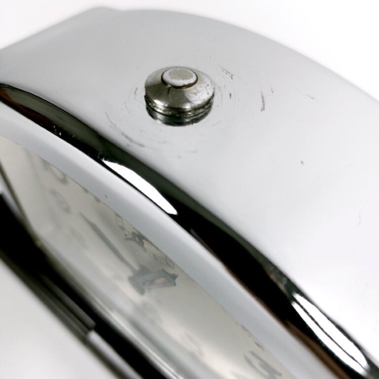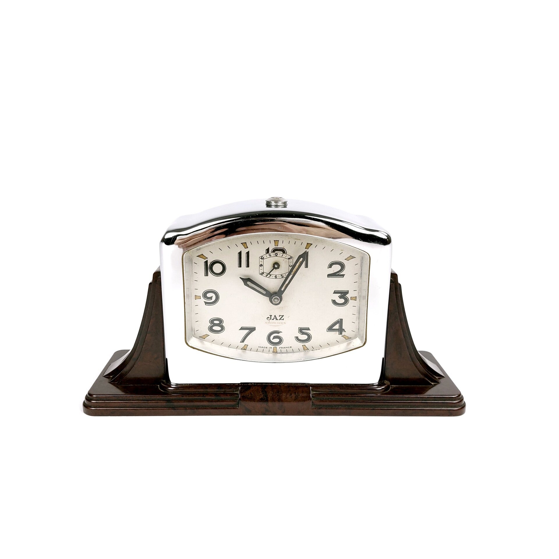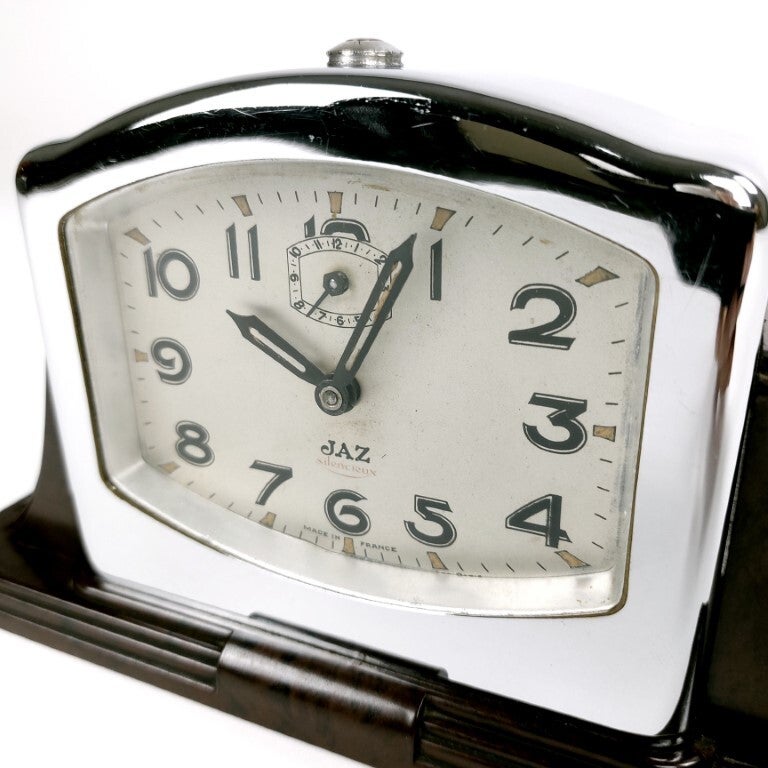 Zeer mooie art deco tafelklok uit 1940 in bakeliet en chroom van de Franse horlogemakers Jaz uit Parijs. Prachtig ontwerp in donkerbruine gemarmerde bakeliet. Het is een mechanische opwindbare klok van het type 'silencieux', en ze tikt inderdaad heel stil. Ze heeft ook een wekkerfunctie die nog perfect werkt. Aan de achterzijde is de datum 3-10-40 geëtst. In goede staat, het bakeliet is nog perfect, het chroom heeft krassen en één deukje in een hoek, en er is wat roestvorming aan de opwindknoppen. Klok en wekker werken perfect.