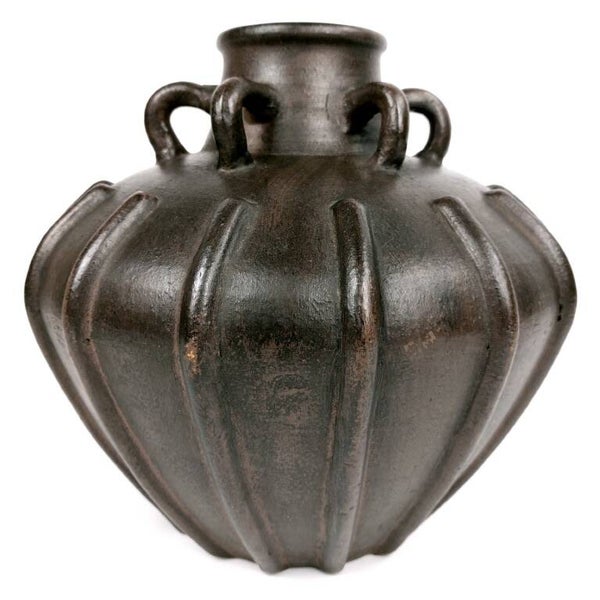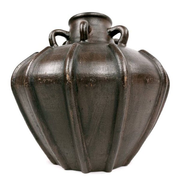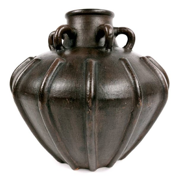 Imposante grote kruik in terracotta aardewerk, brutalistisch, uit de 2e helft van de 20e eeuw. Prachtig ontwerp met de lijnen in reliëf en de 6 oren. De donkerbruine kleur maakt hem nog stoerder. Een indrukwekkende centerpiece! In zeer goede vintage staat, er is enkel één klein chipje helemaal onderaan de kruik (onopvallend).