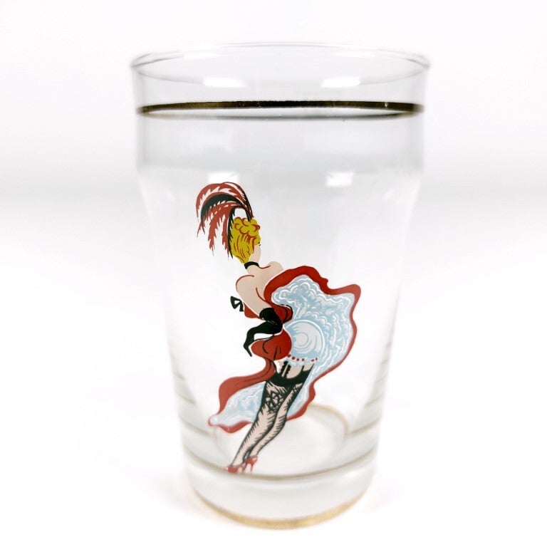 Leuke frivole set glazen uit de jaren '50 of '60 met French Cancan danseressen, zoals in de bekende Moulin Rouge te Parijs. De set bestaat uit 6 glazen, en een leuk detail is dat op elk glas de danseres in een verschillende pose staat. Mooi afgewerkt met vergulde boorden en gedetailleerde afbeeldingen. In uitmuntende staat.
