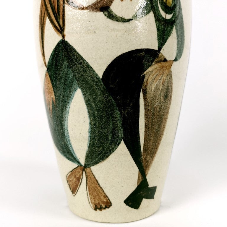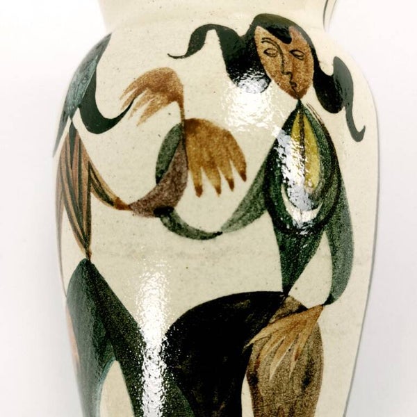 Zeldzame vaas in keramiek uit de jaren '60 van het Belgische atelier Perignem. Mooi en speciaal decor met dansende figuren in typische 60's stijl en kleuren. De vaas is onderaan gesigneerd. In heel goede staat, er is enkel een horizontale snede (waarschijnlijk van bij de fabricage), maar dit valt niet erg op.