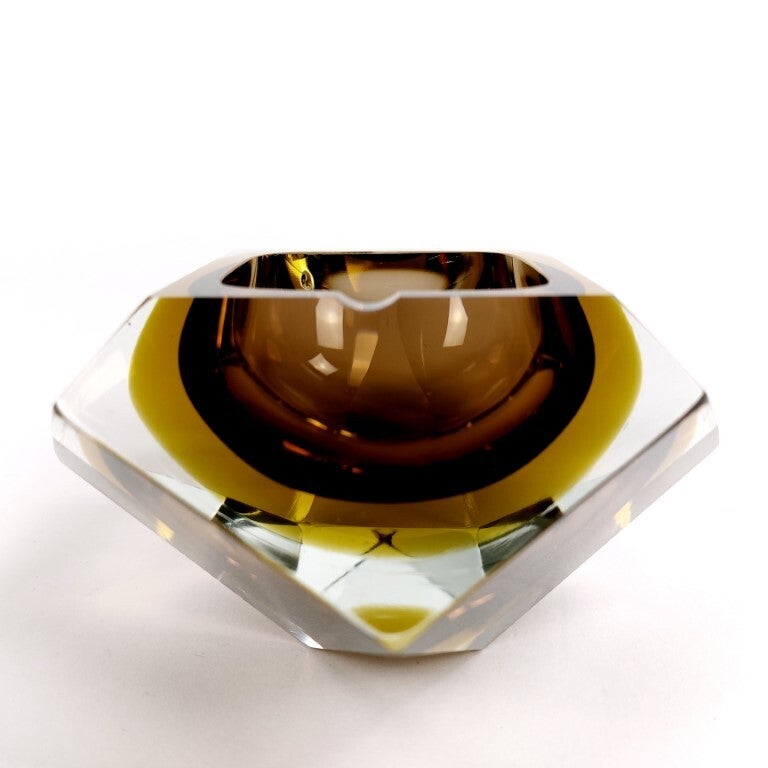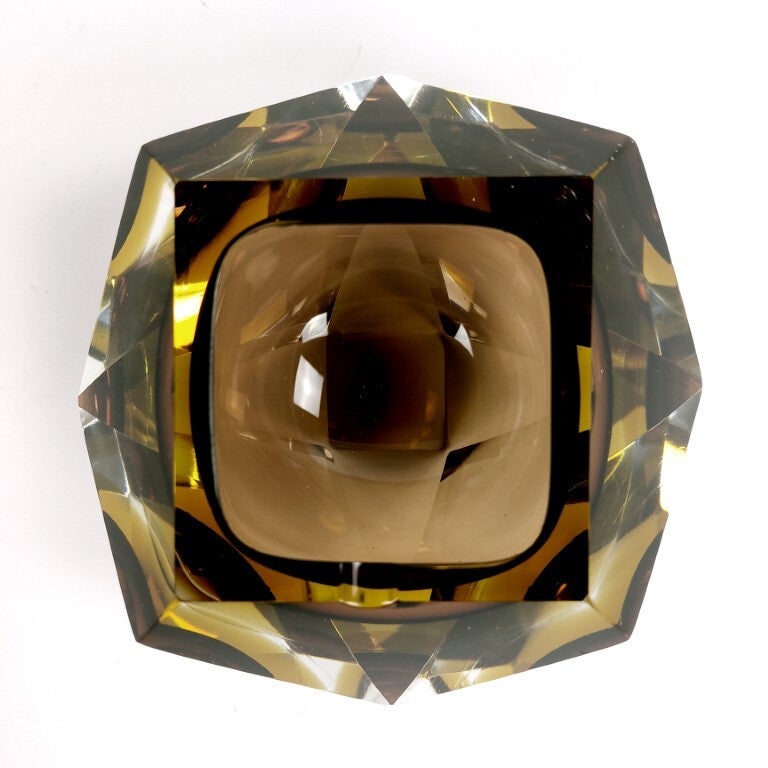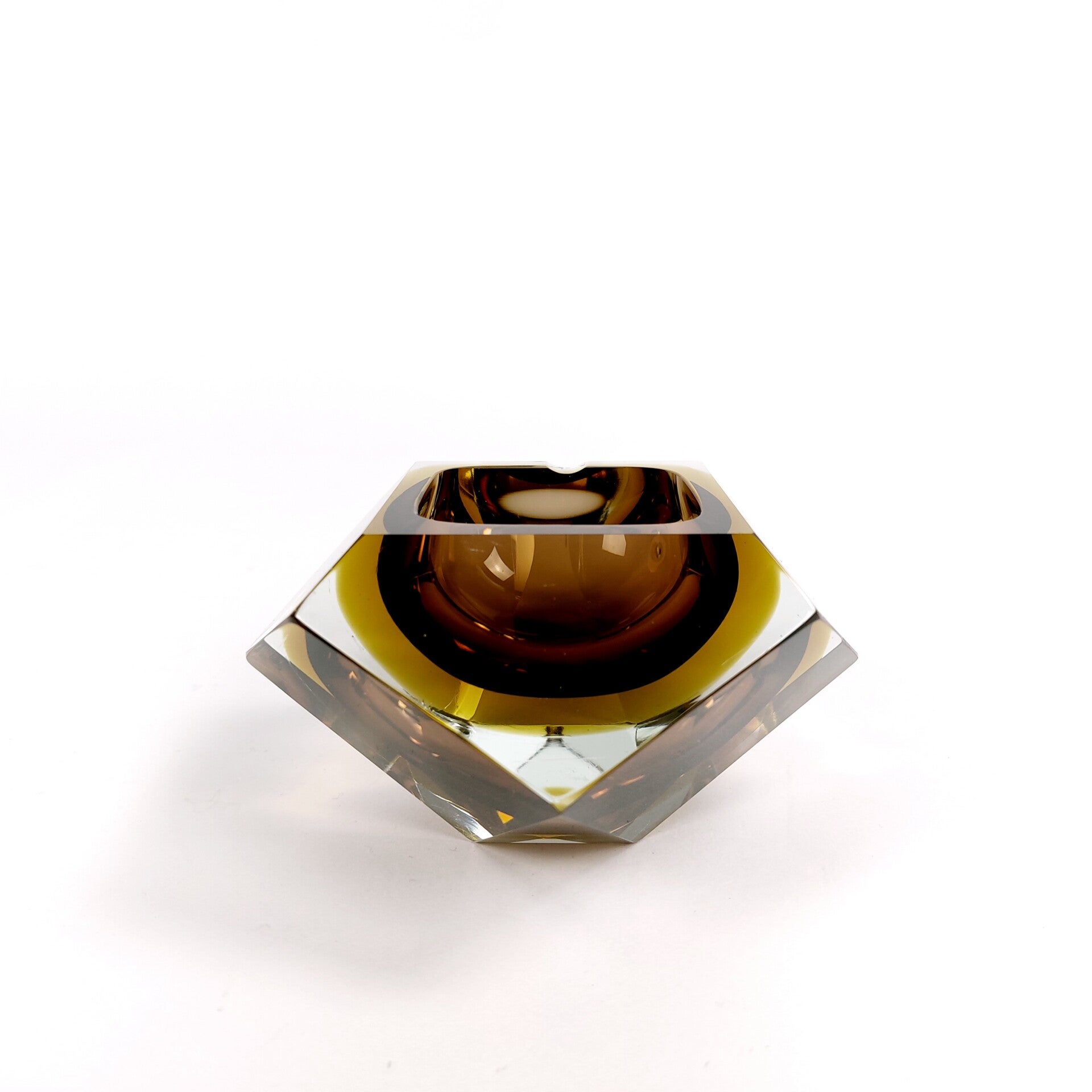 Schitterende asbak in Murano glas/kristal in Sommerso stijl. Daterend uit de jaren '60 en ontworpen door de Murano glaskunstenaars van Mandruzzato of Flavio Poli. De gefacetteerde diamantvorm en de kleurencombinatie van bruin en amber in Sommerso techniek zorgen voor een prachtig licht- en kleurenspel. De asbak kan natuurlijk ook als vide-poche of schaaltje gebruikt worden. In schitterende, zo goed als perfecte staat, enkele minuscule krasjes.