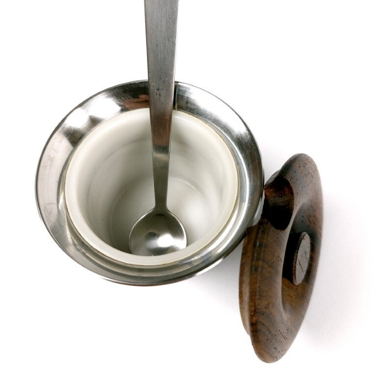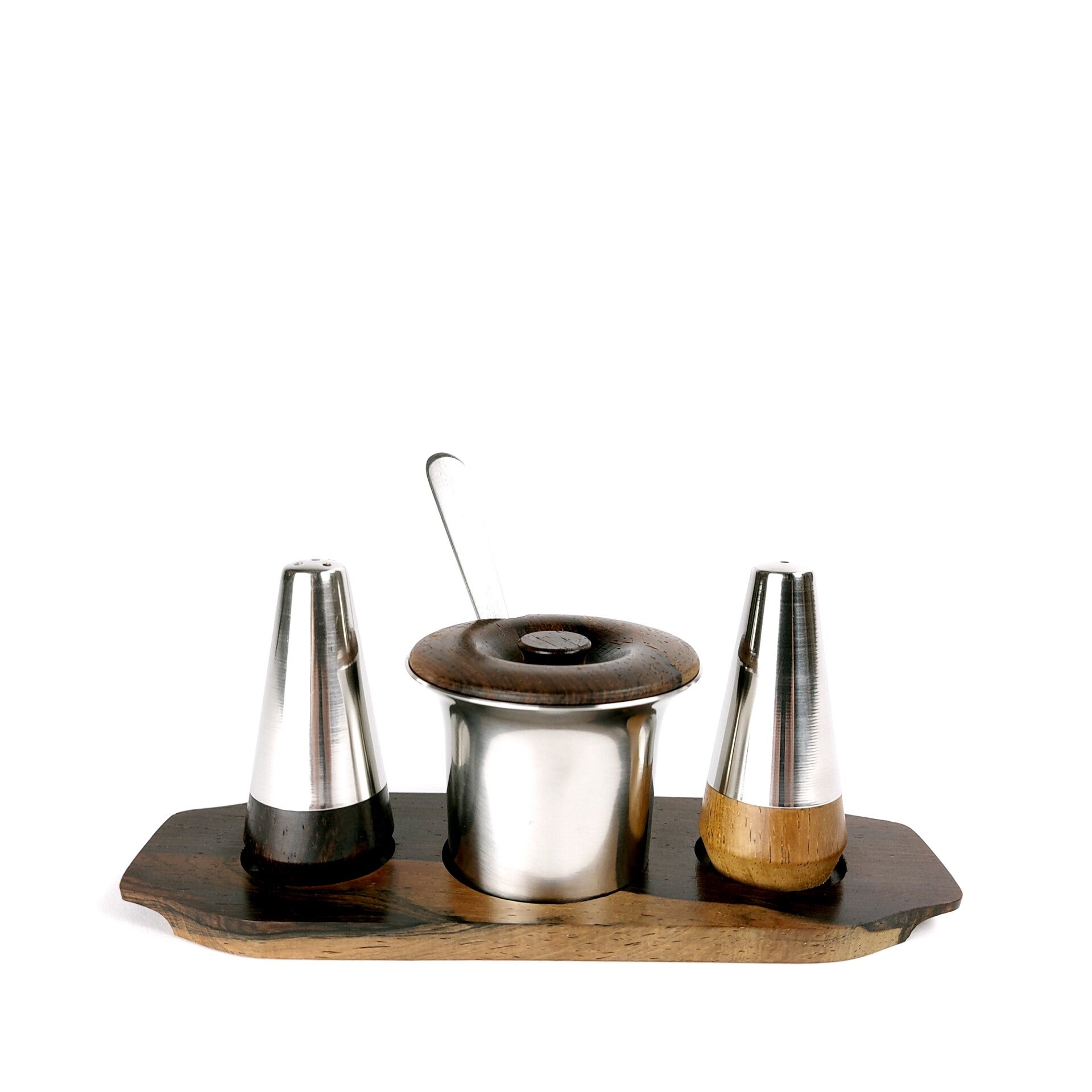 Stijlvol dineren met dit Deens tafelsetje van Lundtofte uit de jaren '60. De set bestaat uit een onderzetter in rozenhout, peper en zout stel in rozenhout en roestvrij staal, en een mosterdpotje met lepeltje in roestvrij staal en teak dekseltje. Mooi en elegant Deens design, en in uitmuntende staat (enkele minieme gebruikssporen).