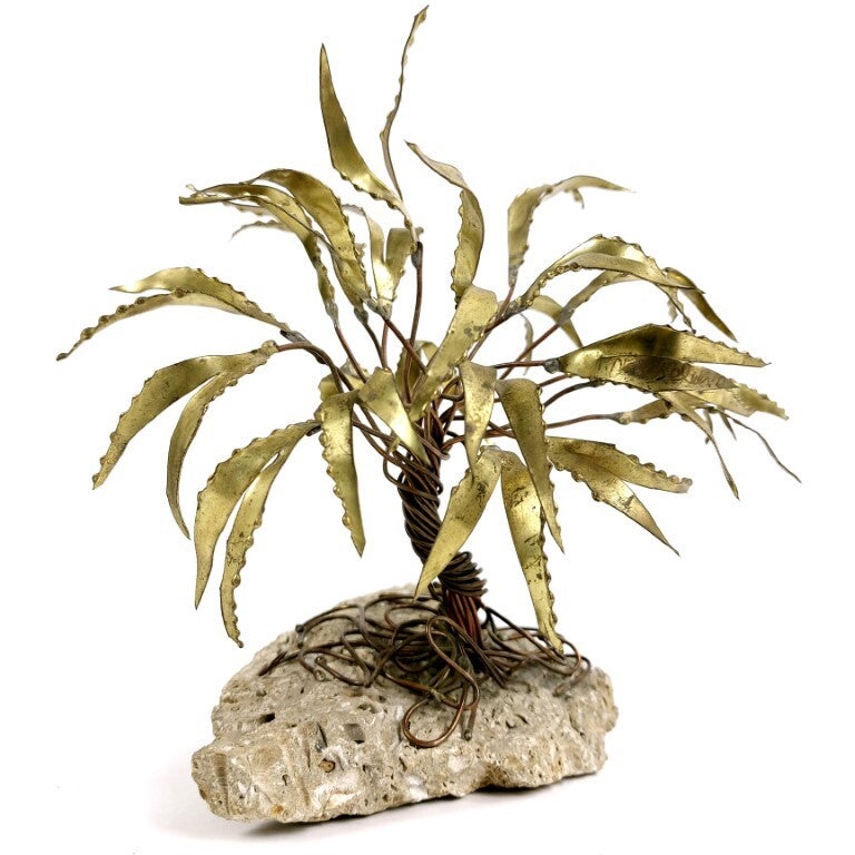 Mooi beeldje van een palmboom op een rots van de Belgische kunstenaar Daniel D'Haeseleer uit de jaren '70. Zeer decoratieve en tijdloze sculptuur in Hollywood Regency stijl. De palmboom is gemaakt van rood koper en het gebladerte van messing. Het is gesigneerd op één van de blaadjes. In heel goede vintage staat, met wat patina op het messing.