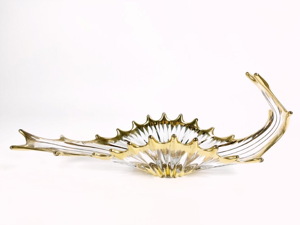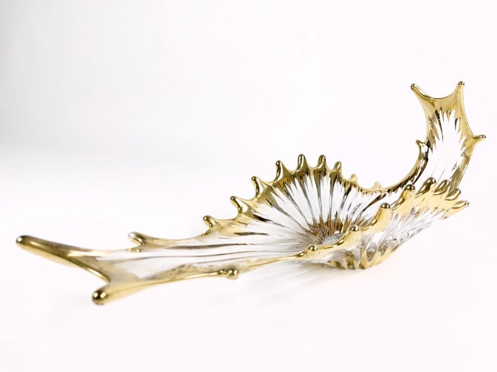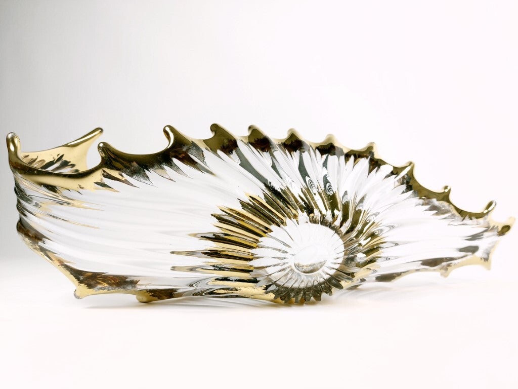 Grote coupe of milieu de table in kristal uit de jaren '50 van de Cristallerie Royale de Bayel (Frankrijk). Zeer mooie eyecatcher en vrij zeldzaam door z'n kleine productie. De knappe vorm is geïnspireerd door koralen en anemonen, en de randen en het midden zijn 18 karaat verguld. In heel goede staat, met wat ouderdomssporen op het verguldsel.
