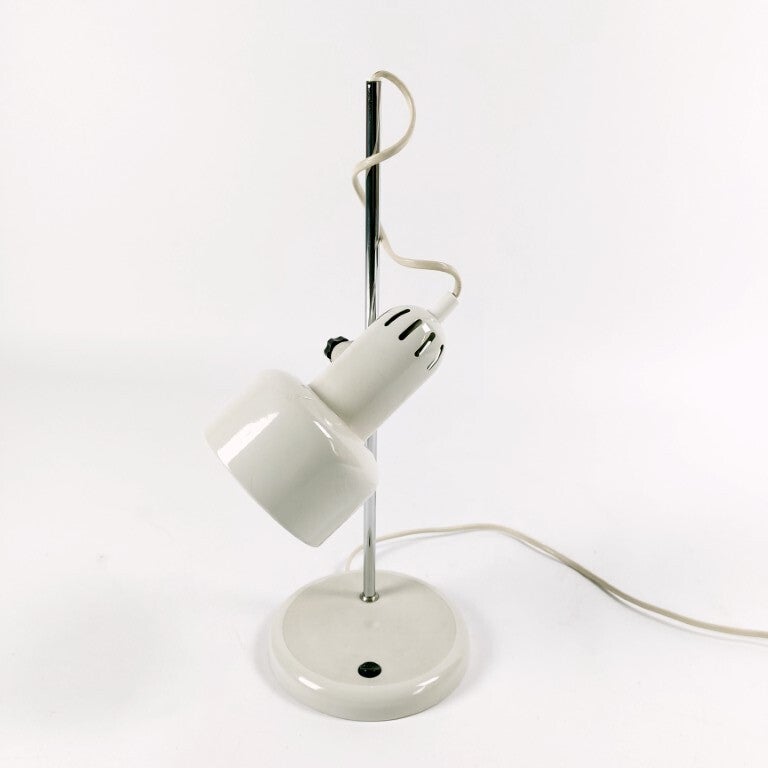 Vintage witte bureaulamp uit de jaren '70 of '80, van het Duitse Brilliant Leuchten. De kap is in hoogte verstelbaar, en kan zowel horizontaal als verticaal draaien. De voet is in kunststof, de arm in chroom, en de kap in metaal. In zo goed als perfecte staat, amper gebruikssporen merkbaar.