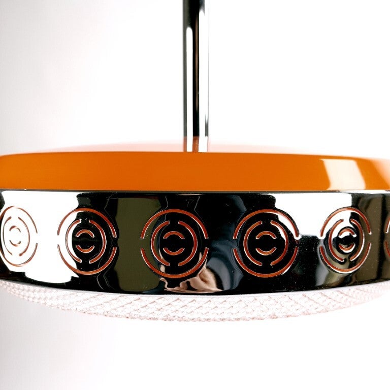 Knappe space age 'UFO' hanglamp uit de jaren '60 of '70 van het Aalsterse Liro Lighting, afgewerkt met chroom en acryl. Mooi lichtspel aan alle zijden van de lamp : onderaan door de acryl kap, bovenaan licht de oranje plastic kap op, en aan de zijkanten schijnt het licht door het uitgesneden decor in chroom. In heel goede vintage staat, lichte gebruikssporen.