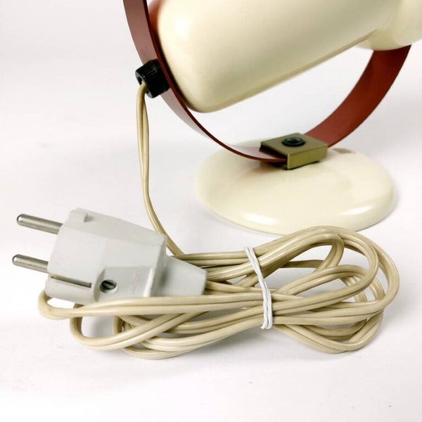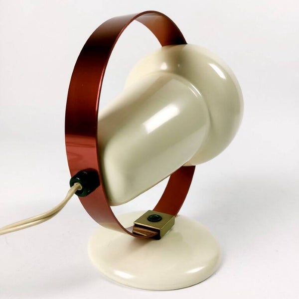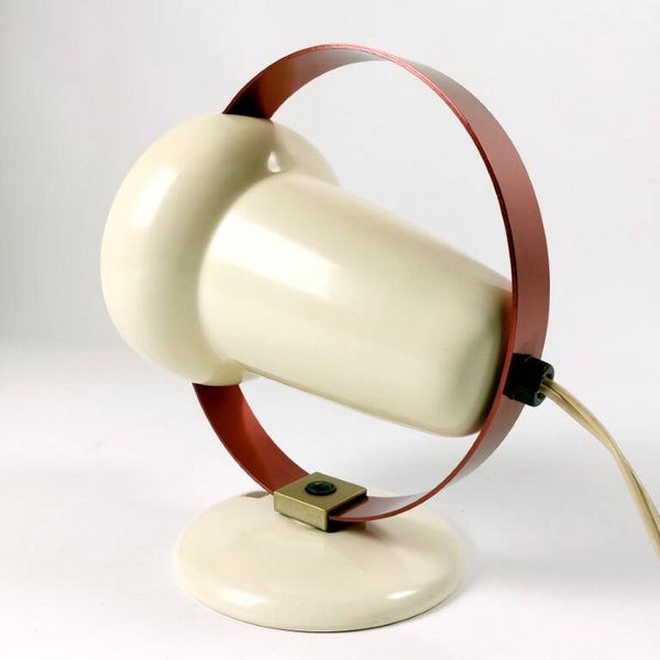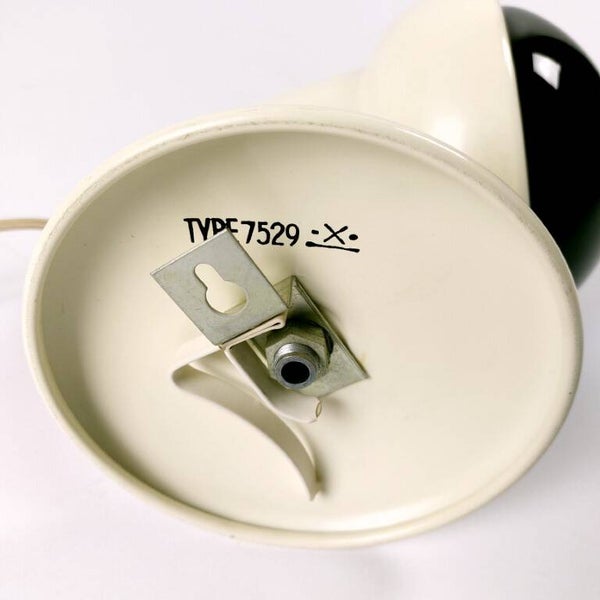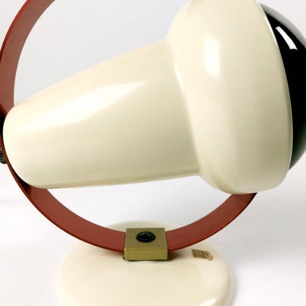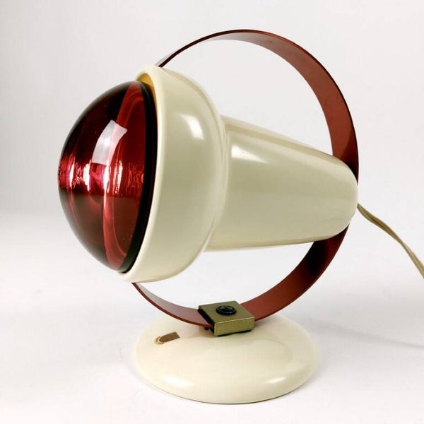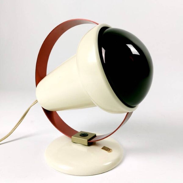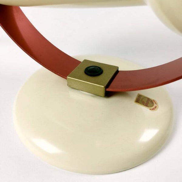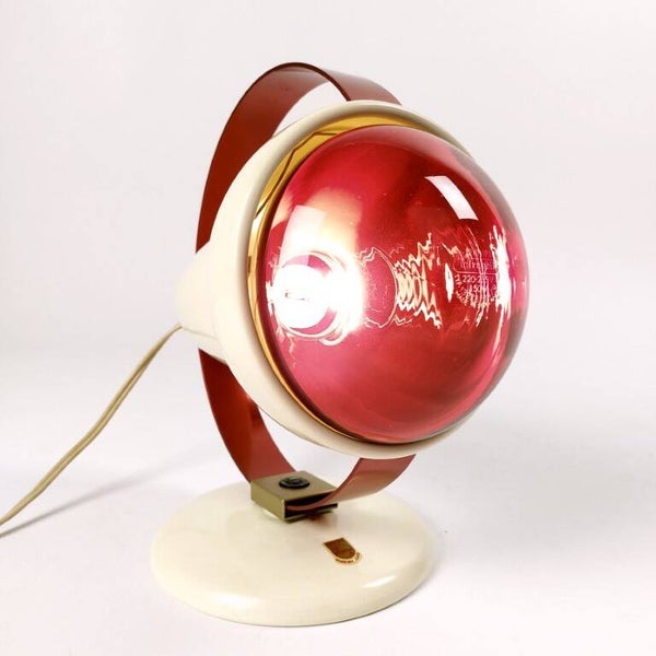 Funky infraroodlamp uit de jaren '50 van Philips, genaamd Infraphil, type 7529. Het spacey ontwerp wordt vaak verkeerdelijk toegeschreven aan Charlotte Perriand. Deze infrarood warmtelampen werden gebruikt voor therapeutische en medische doeleinden. De konische lamp kan 360° ronddraaien en op en neer kantelen door de aluminium rode ring, en ze kan ook opgehangen worden. In quasi perfecte staat, zeer minieme ouderdomssporen. De lichtbron is inbegrepen.