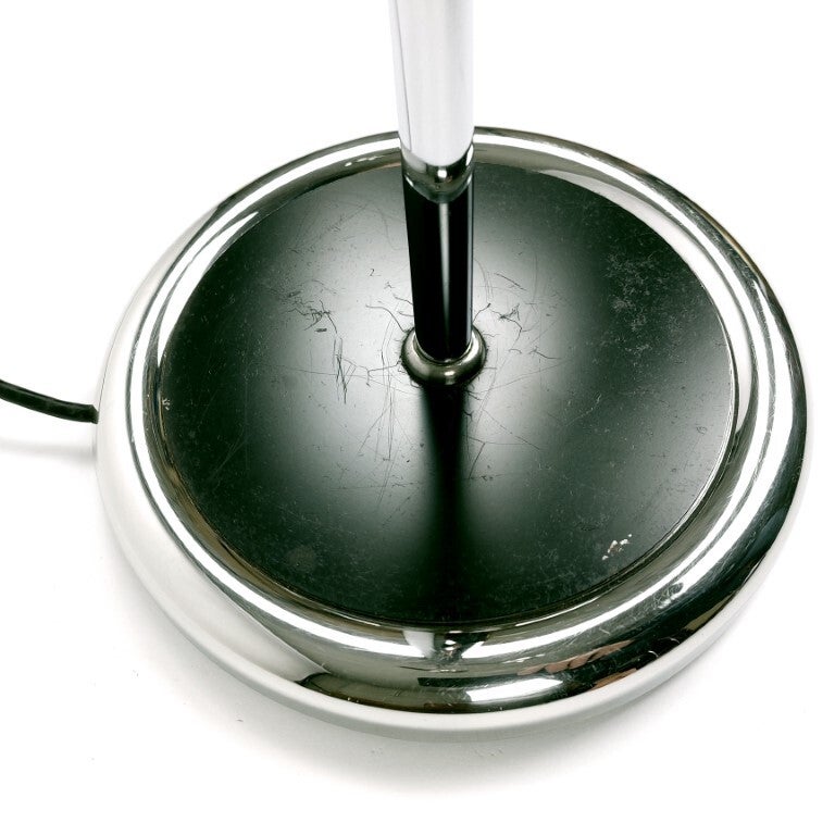 Knappe vloerlamp uit de jaren '70 in chroom met 2 spots. De spots kunnen op en neer en zijwaarts bewegen. Met de voetschakelaar kunnen beide lampen samen of apart ingeschakeld worden. In goede vintage staat, met gebruikssporen op de voet, het chroom is nog in heel goede staat.