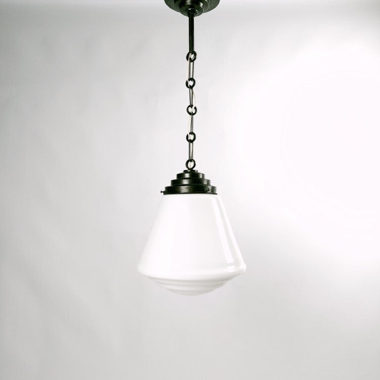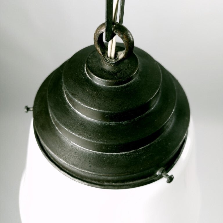 Mooie art deco hanglamp uit de jaren '30, waarschijnlijk van Philips. Het knappe ontwerp in trapvorm en het witte opaline glas geven de lamp z'n elegant en tijdloos karakter. Het glas is in perfecte staat, de koperen kappen hebben wat patina opgedaan in de loop der jaren.