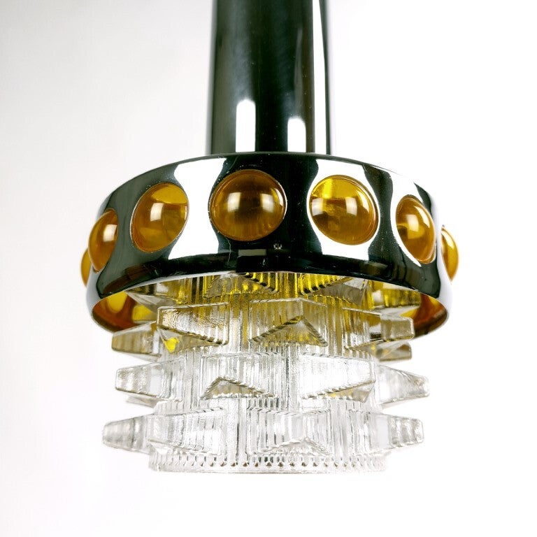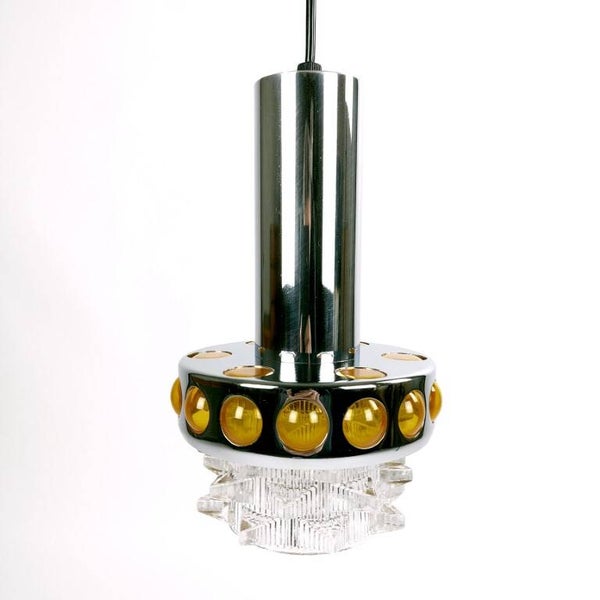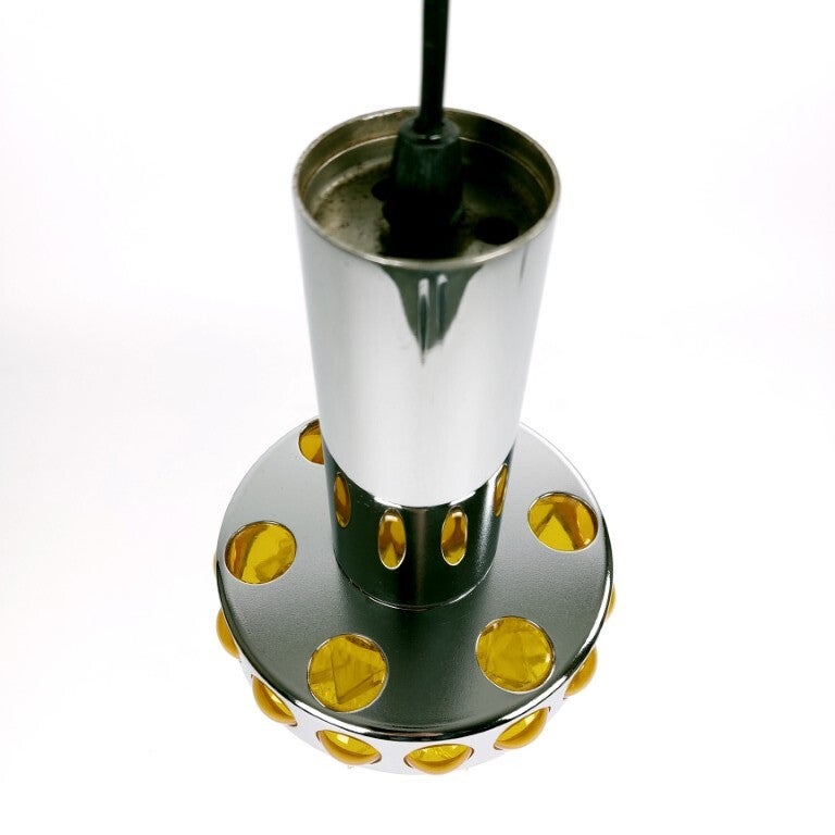 Hanglamp in chroom, glas en plastic uit de jaren '60 of '70 van Massive. De oranje cirkels aan de zijkant en bovenaan geven een heel mooi lichteffect aan deze eyecatcher. De glazen kap werd gemaakt door de Belgische glasproducent Doyen. In zeer goede vintage staat, amper ouderdomssporen merkbaar.